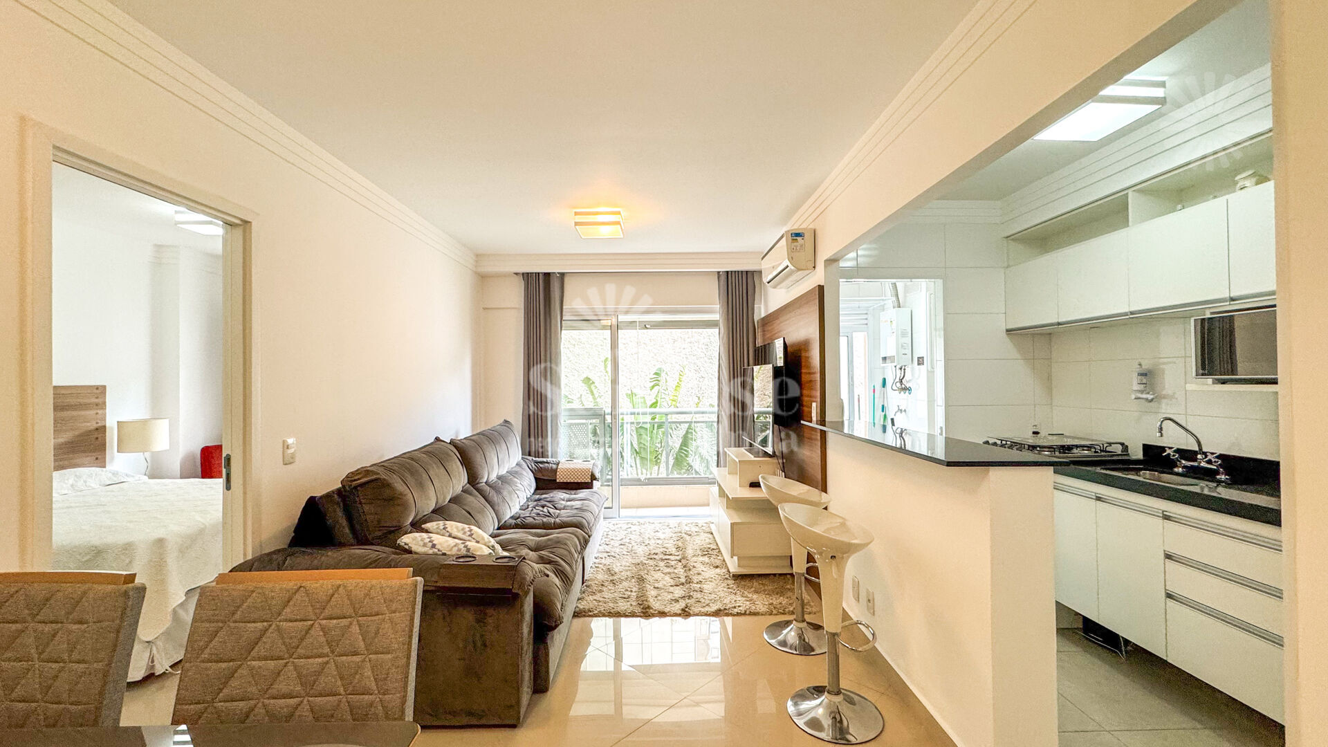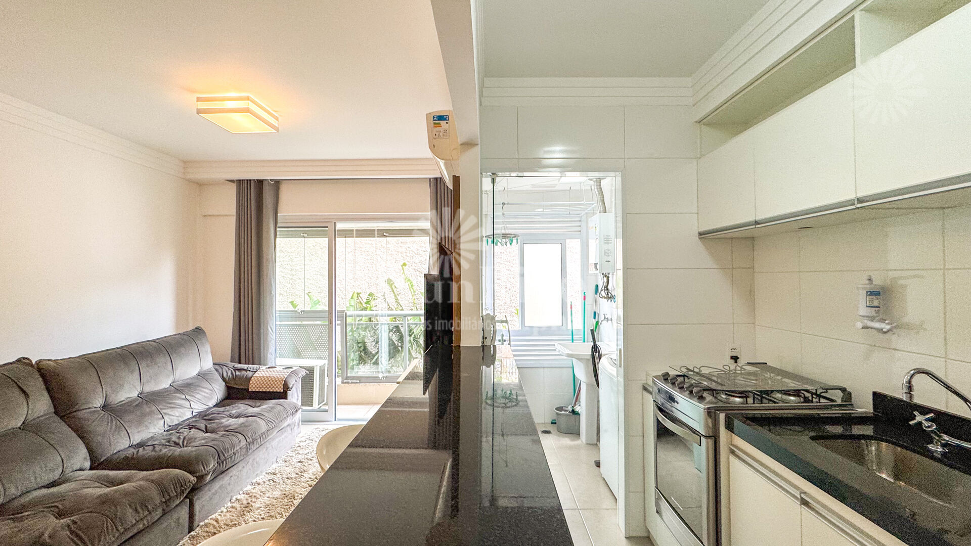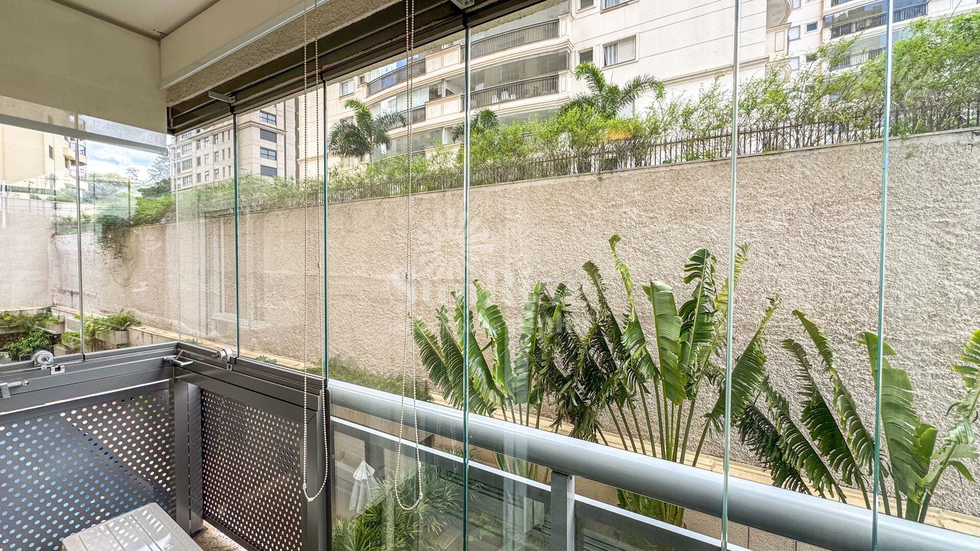 Lindo apartamento mobiliado com 49 m2 de área, possui lavabo, cozinha completa, máquina de lavar roupas, TV, 1 quarto sendo este suíte com cama queen, ar-condicionado na sala, varanda com fechamento de vidro e 1 vaga de garagem..
