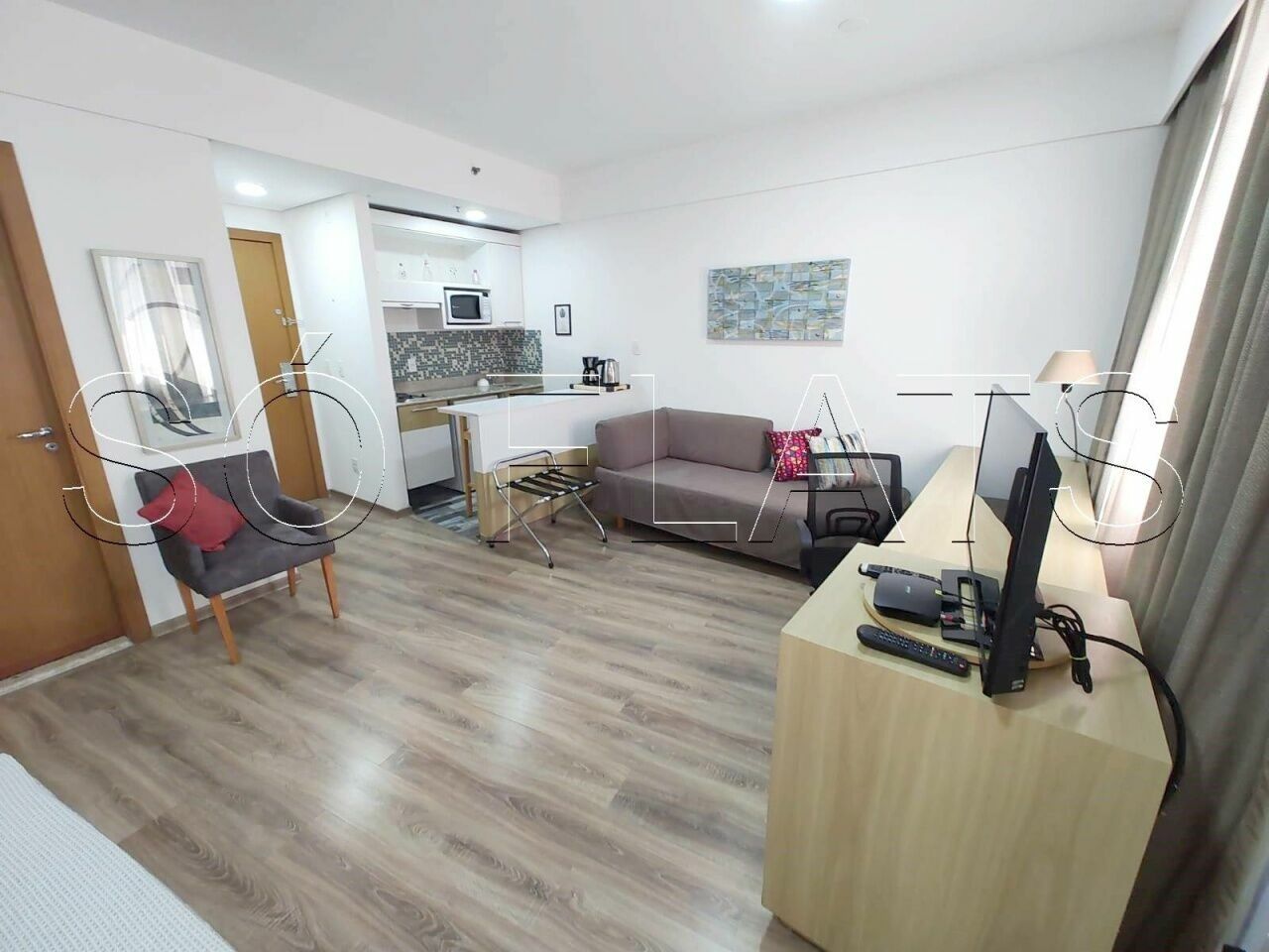 O apartamento com 31m² no modelo Studio, mobiliado e equipado, com 1 dormitório, cozinha americana, possui ar-condicionado, isolamento acústico. O apartamento tambem dispõe de 1 vaga de garagem.