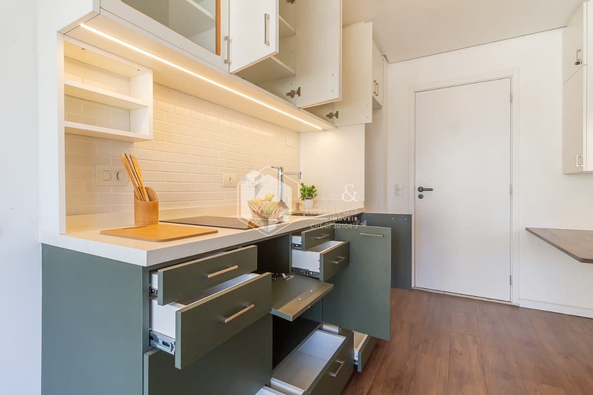 Cozinha equipada com armários planejados, bancada funcional e acabamento sofisticado;