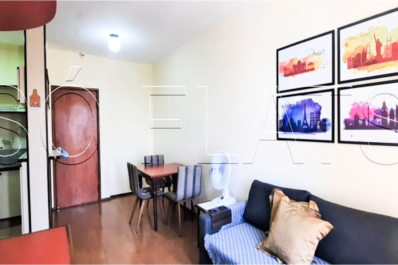 Apartamento mobiliado e equipado com 43m² distribuídos em 1 dormitório, sala com 2 ambientes e cozinha completa. O apartamento tambem dispõe de 1 vaga de garagem.
