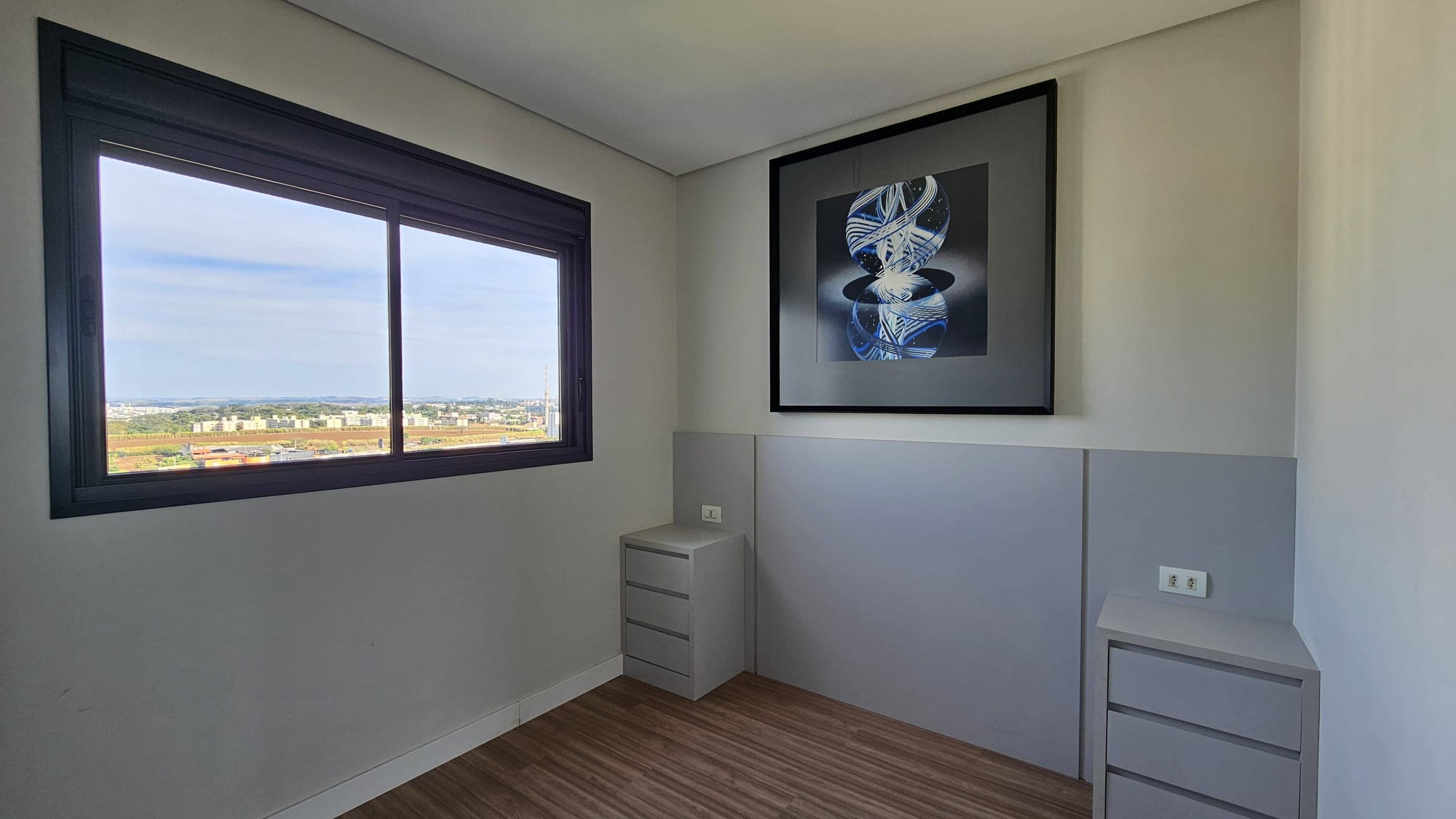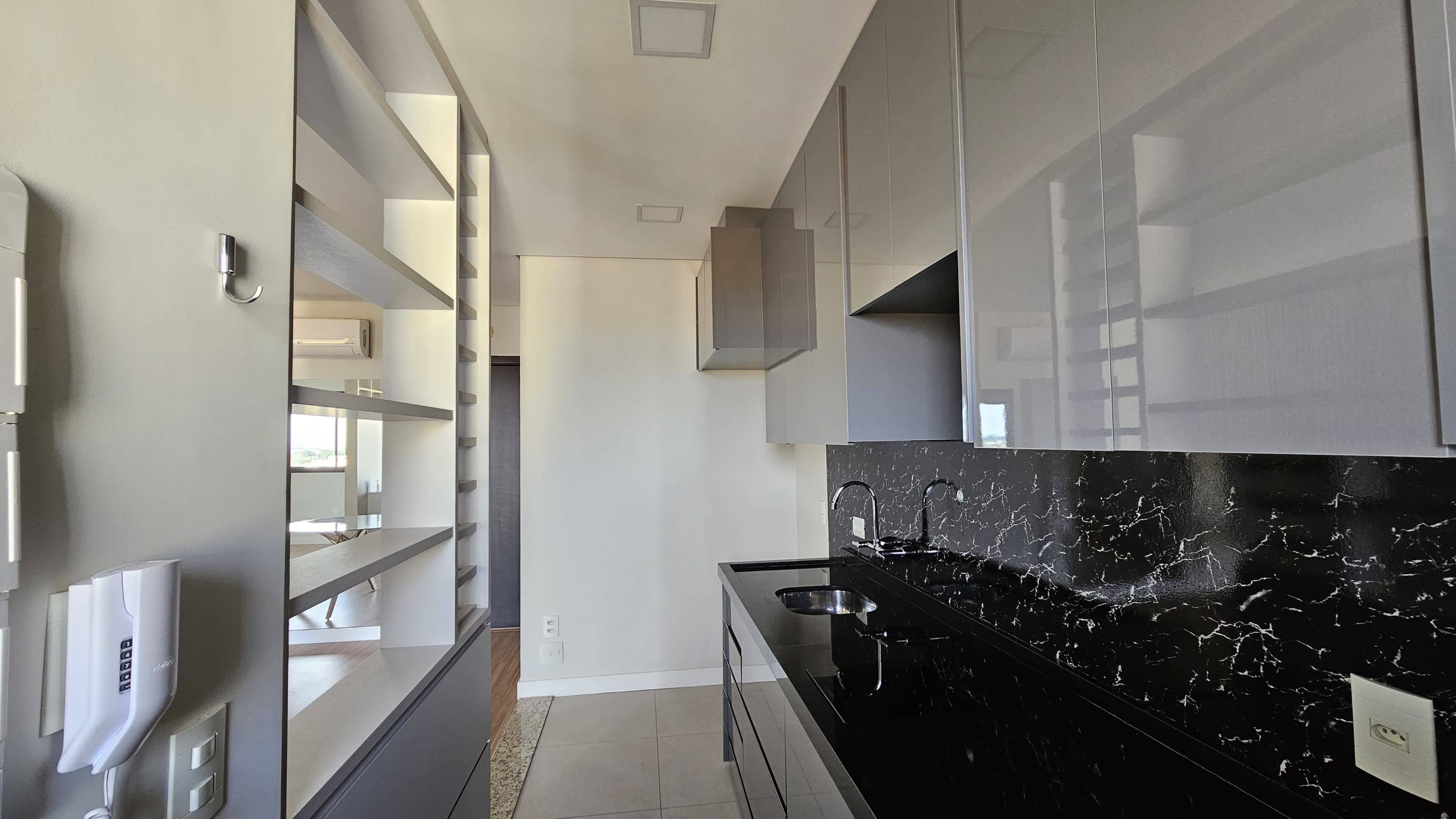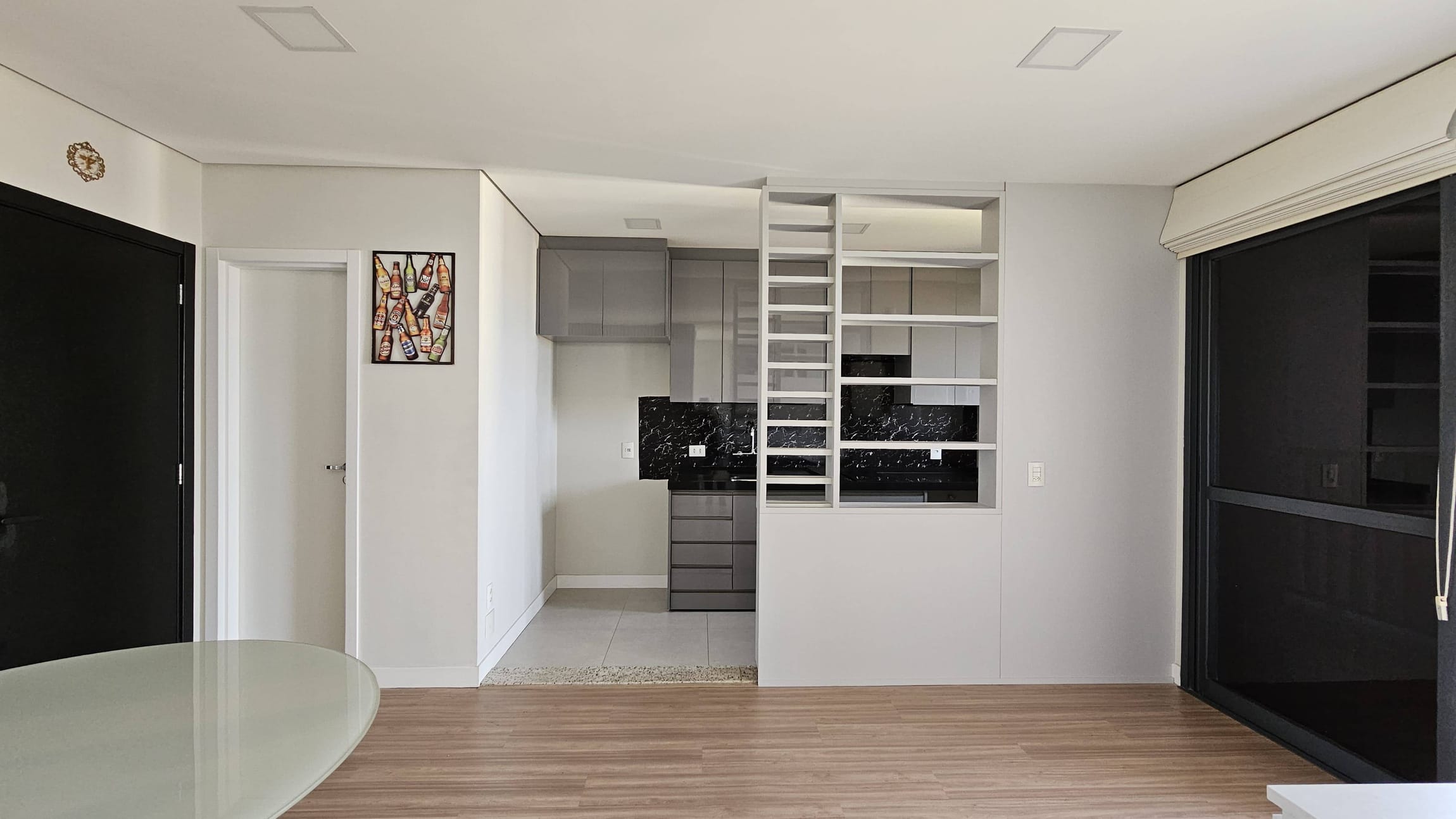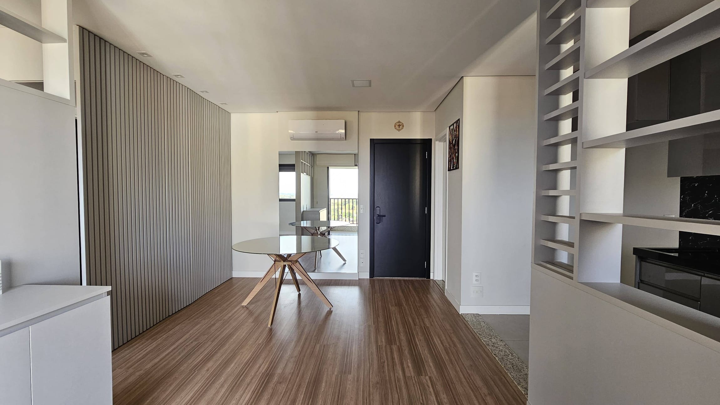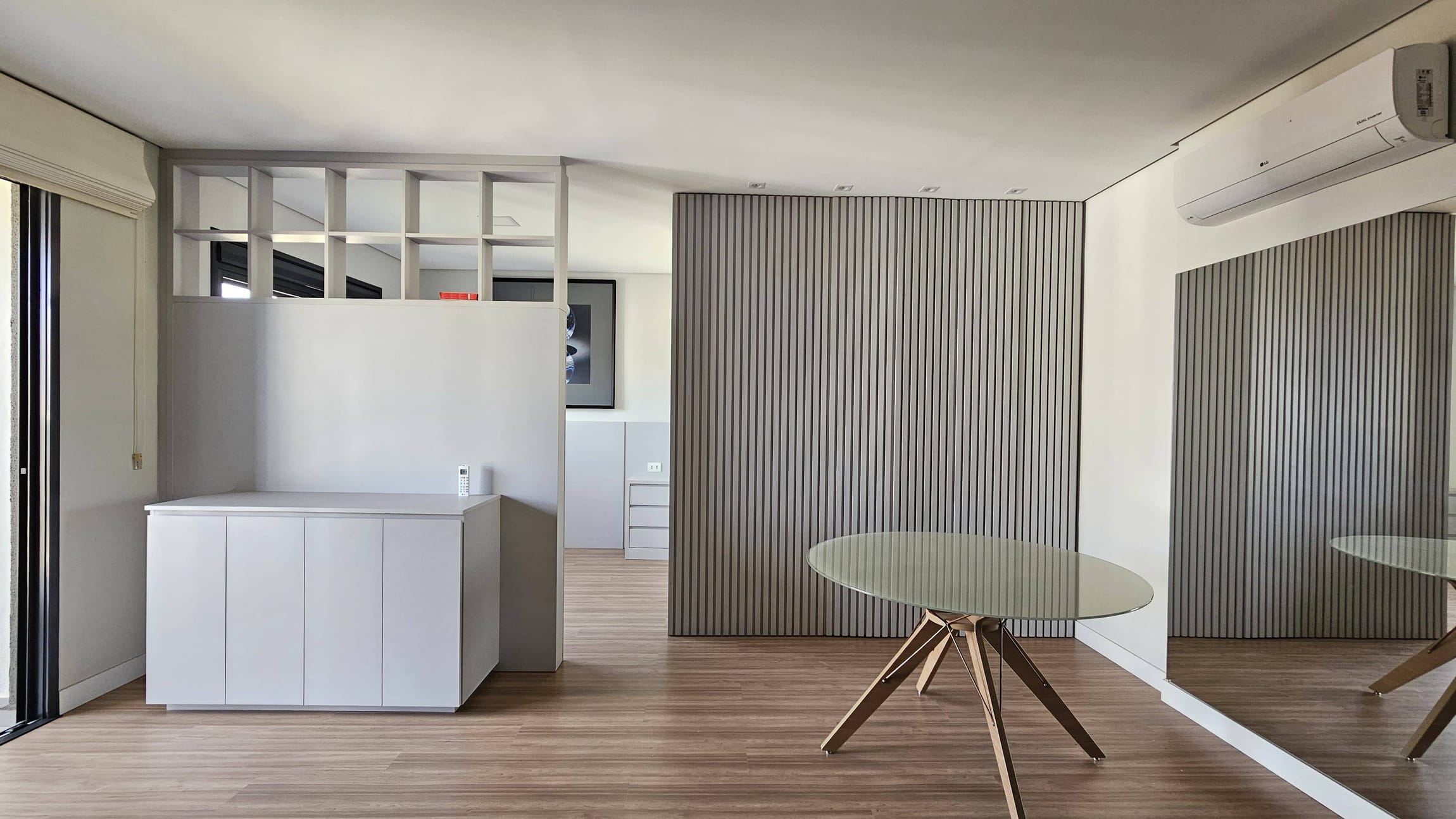 Sala: Piso laminado, mesa de jantar, painel de TV, balcão, ar-condicionado e persiana.