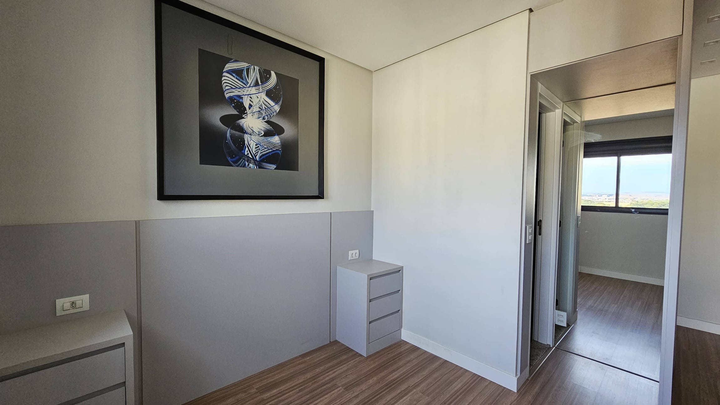 Suíte: Piso laminado, armário planejado, box de vidro, espelho e ótimo acabamento.