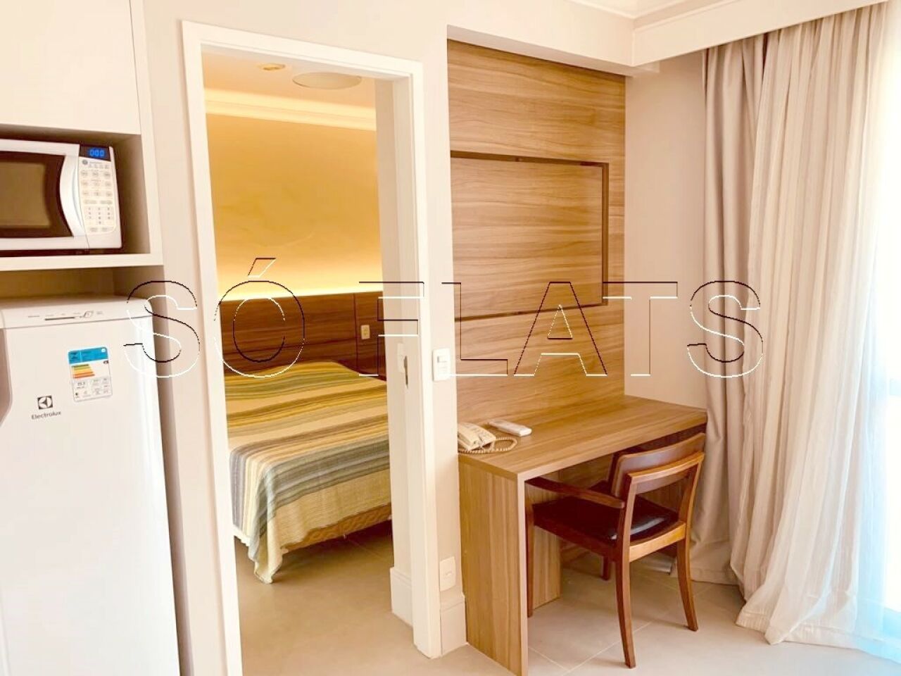 Para seu conforto, mesa de trabalho, ar-condicionado independente com controle remoto, cortinas black-out, minibar, micro-ondas e cozinha americana na sala..