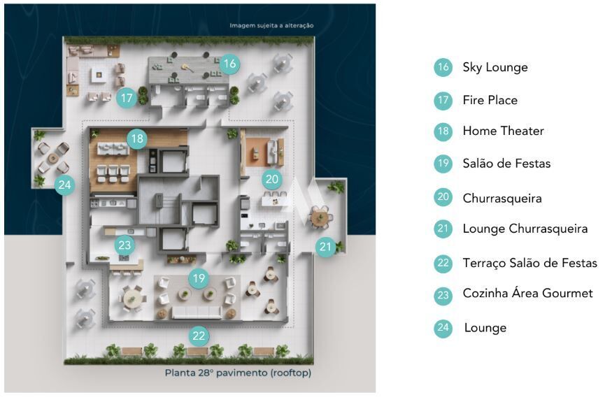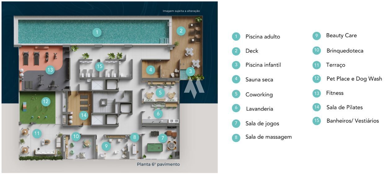 O condomínio traz diferenciais que elevam o padrão de qualidade: fachada moderna e ventilada, portaria com previsão para sistema virtual, rooftop com áreas comuns e quatro pavimentos destinados ao estacionamento. O lazer é completo e diversificado, incluindo piscina adulto e infantil, salão de pilates, sauna seca, fitness, coworking, espaço gourmet, pet place, brinquedoteca, sala de massagem e até home theater. Ambientes comuns são entregues equipados, mobiliados e climatizados, reforçando a atenção aos detalhes.
