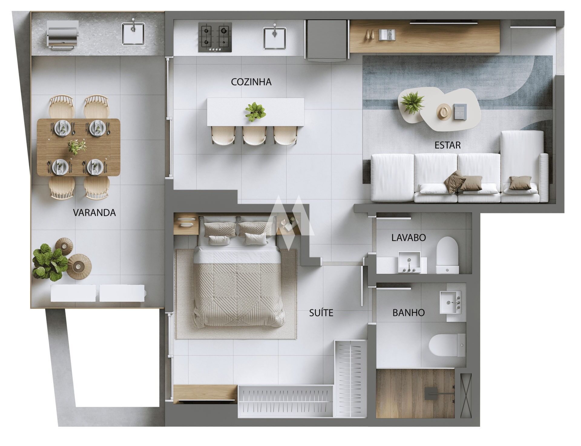 No interior, cada detalhe foi planejado para favorecer a rotina diária. O dormitório é uma suíte confortável e bem iluminada, enquanto a cozinha americana se integra à área social de forma moderna. O lavabo acrescenta praticidade, e o acabamento em piso cerâmico garante durabilidade. O apartamento ainda conta com uma vaga de garagem demarcada.