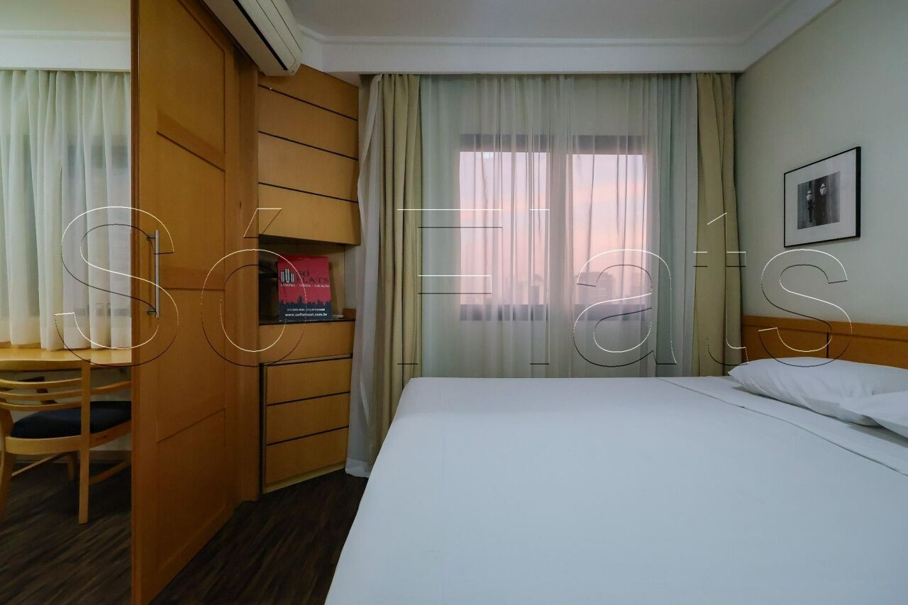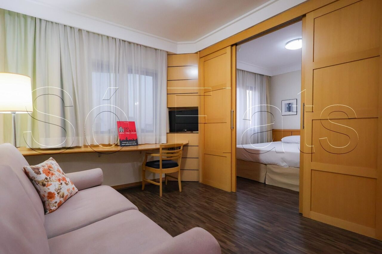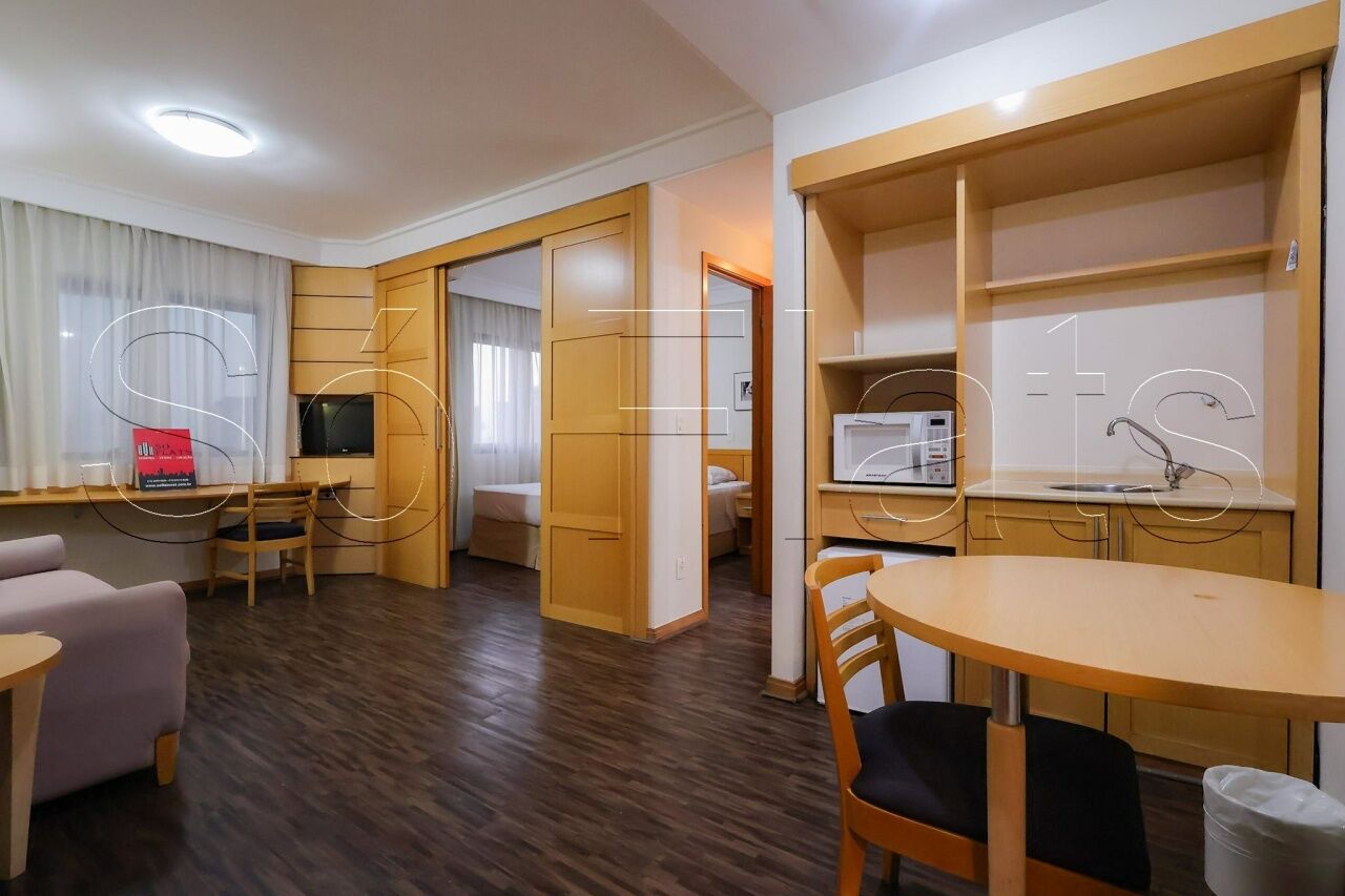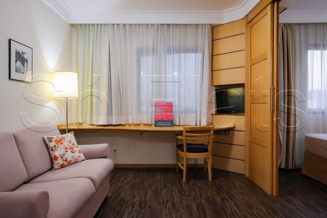 O apartamento com 35m², conta com uma cozinha americana com frigobar e micro-ondas, a sala com uma ótima bancada para trabalho e mesa para refeição, o dormitório com 02 camas box de solteiro reversível para cama de casal, armário para roupas, o televisor em um tampo giratório para servir a sala e o dormitório, ar condicionado central para todos os ambientes do apartamento, e direito a 1 vaga de garagem.