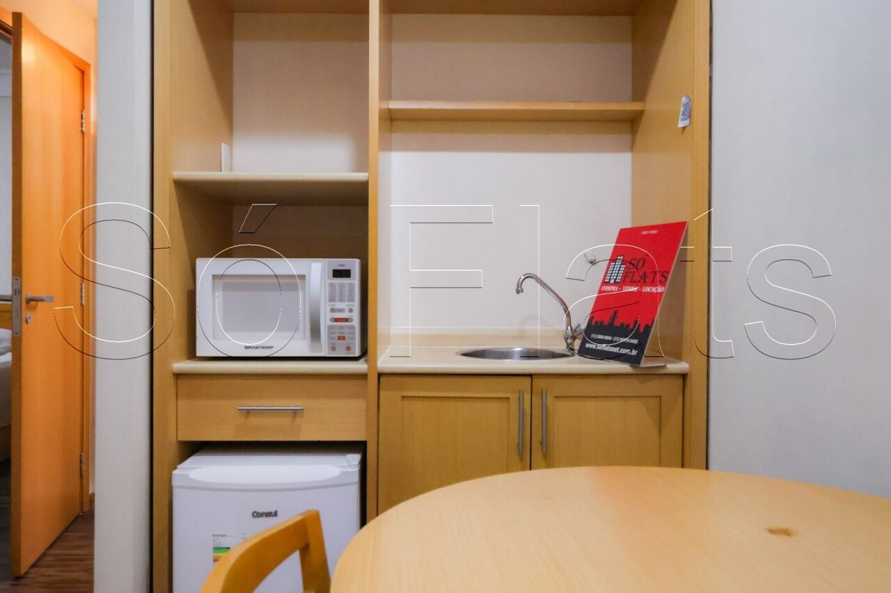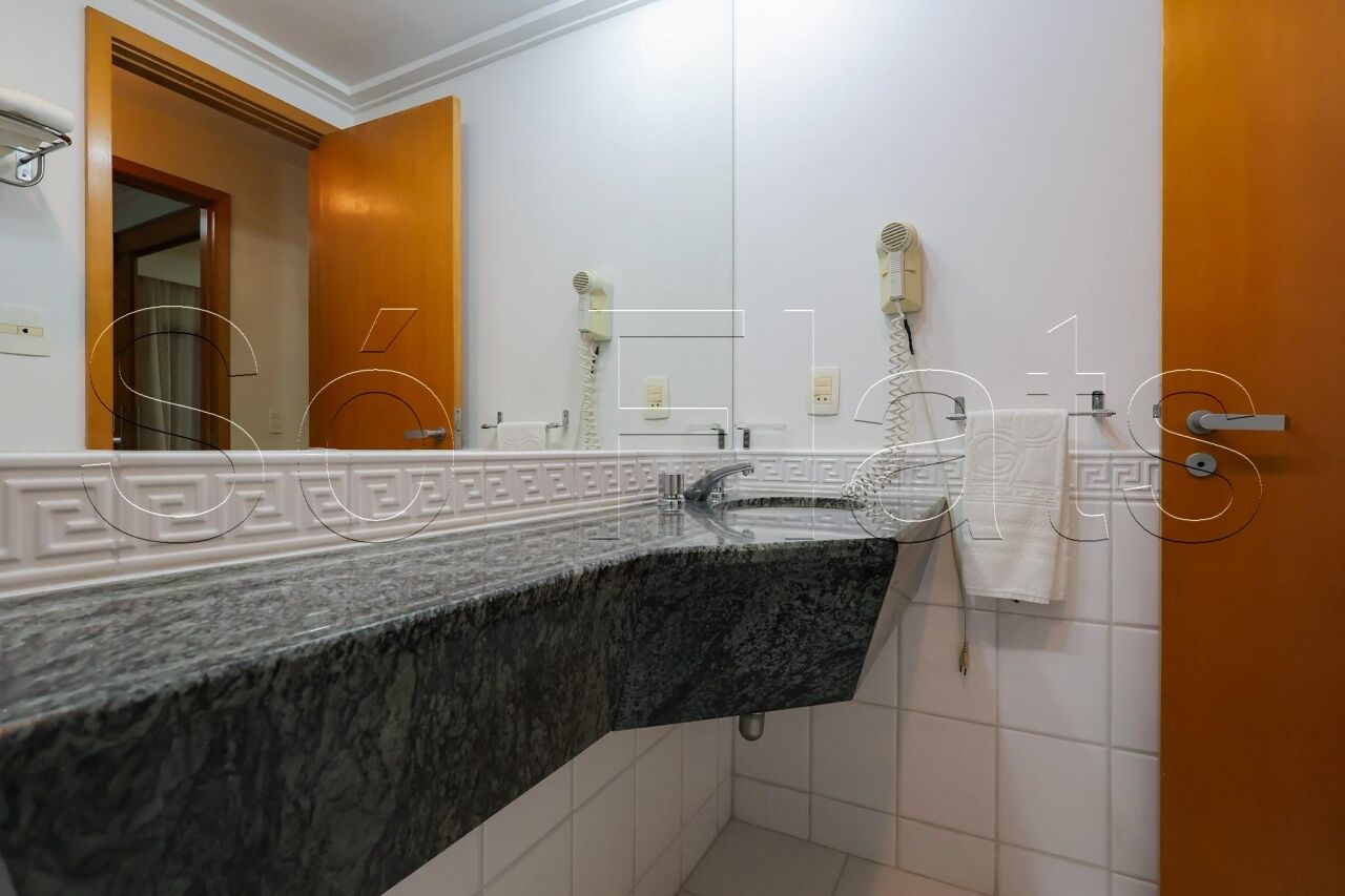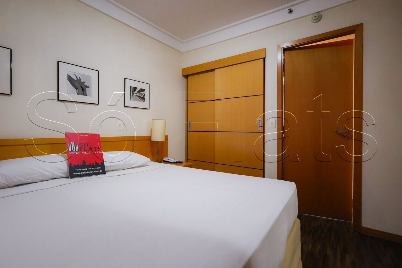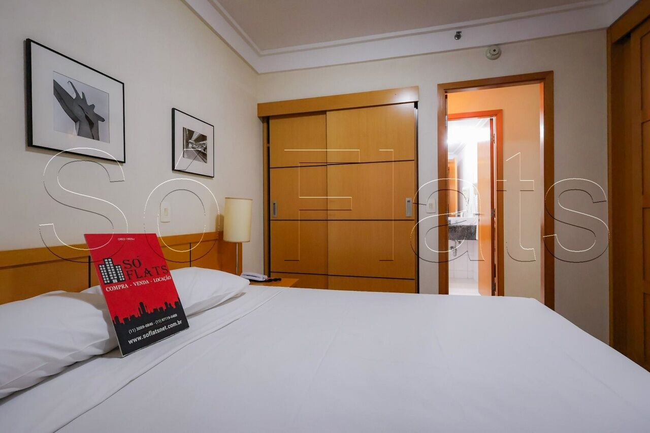 O apartamento com 35m², conta com uma cozinha americana com frigobar e micro-ondas, a sala com uma ótima bancada para trabalho e mesa para refeição, o dormitório com 02 camas box de solteiro reversível para cama de casal, armário para roupas, o televisor em um tampo giratório para servir a sala e o dormitório, ar condicionado central para todos os ambientes do apartamento, e direito a 1 vaga de garagem.