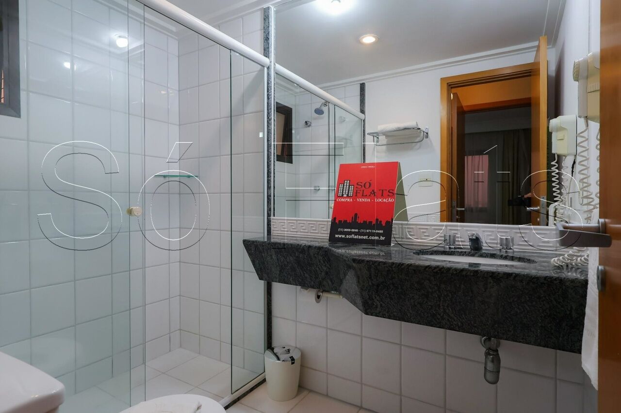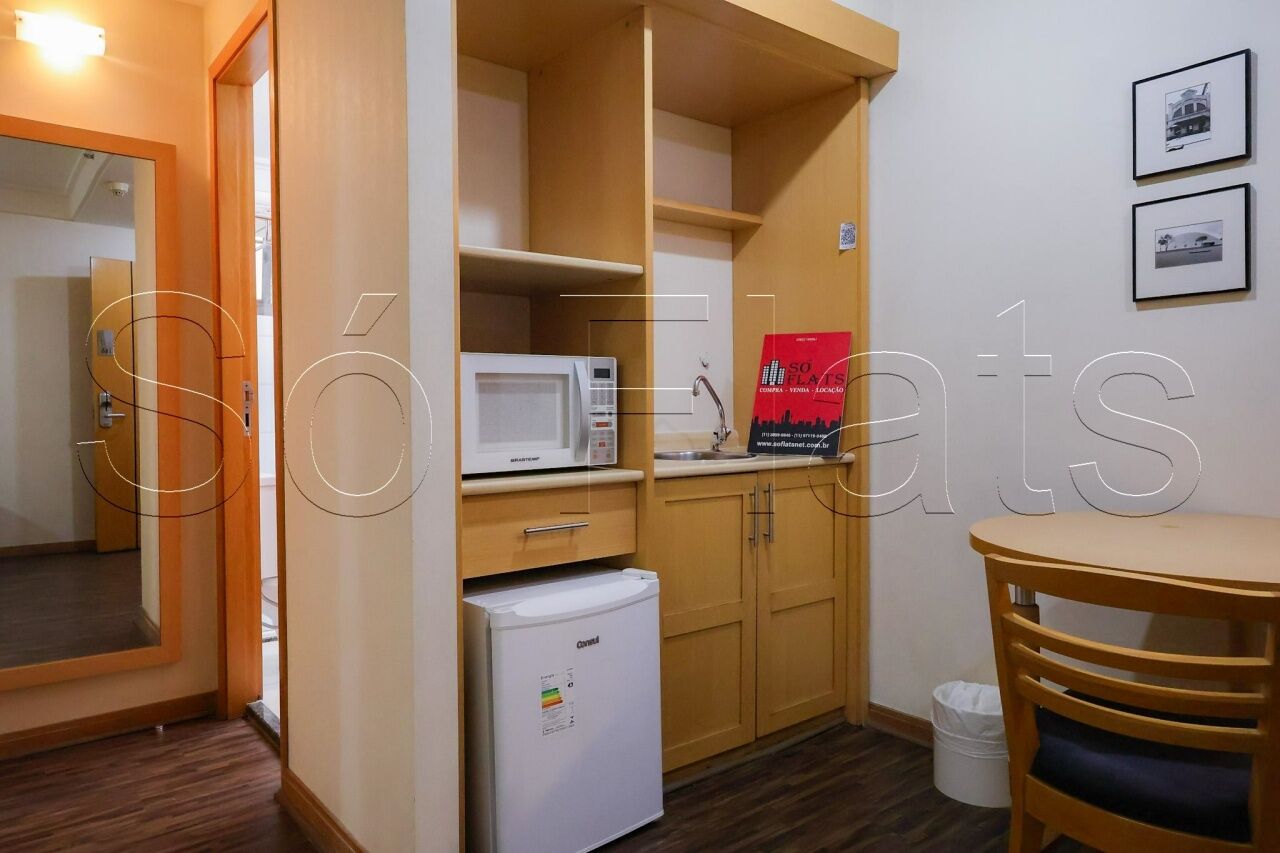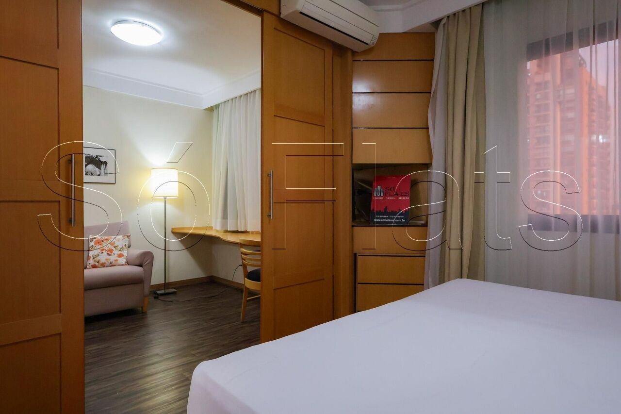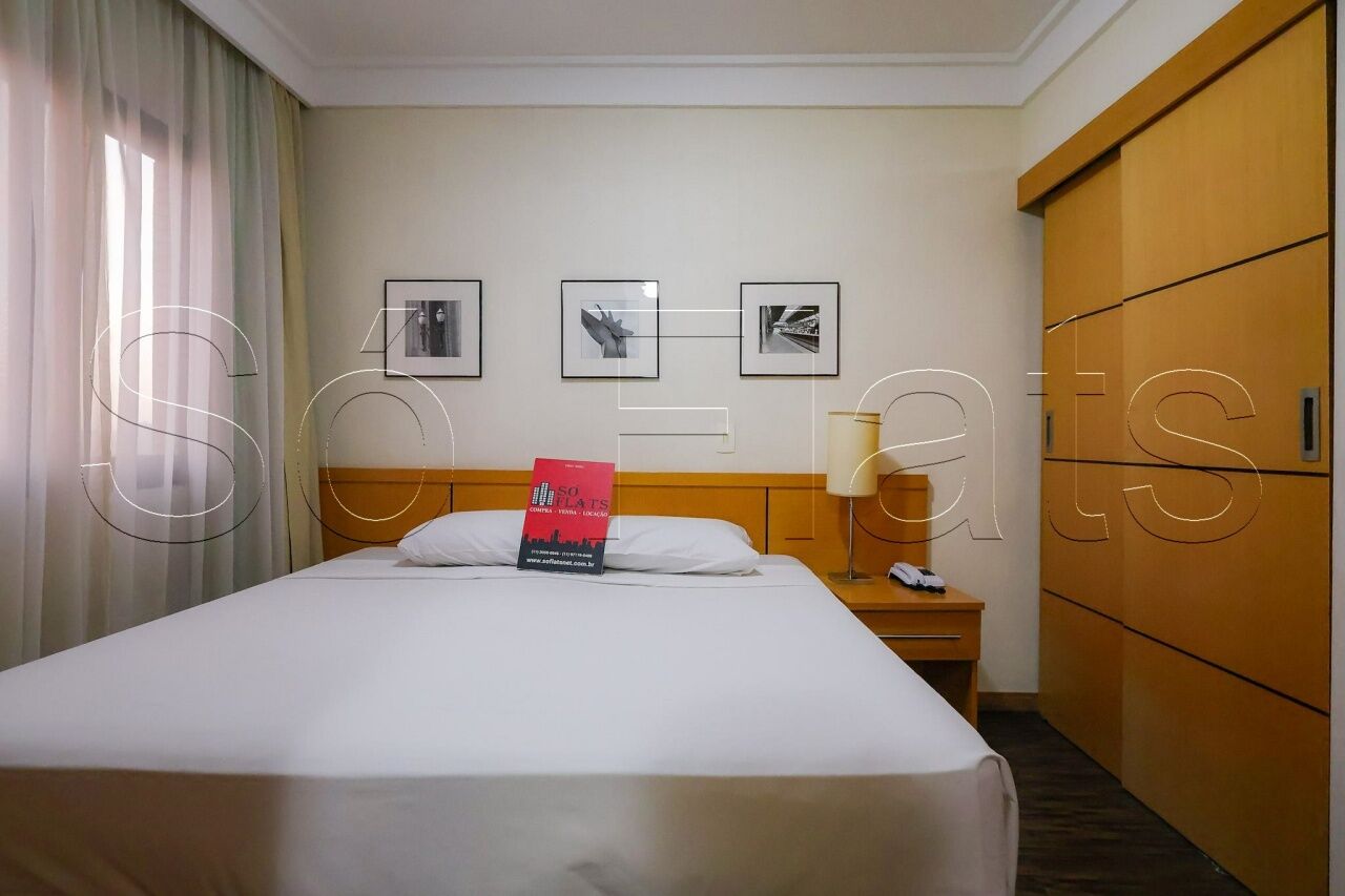 O apartamento com 35m², conta com uma cozinha americana com frigobar e micro-ondas, a sala com uma ótima bancada para trabalho e mesa para refeição, o dormitório com 02 camas box de solteiro reversível para cama de casal, armário para roupas, o televisor em um tampo giratório para servir a sala e o dormitório, ar condicionado central para todos os ambientes do apartamento, e direito a 1 vaga de garagem.