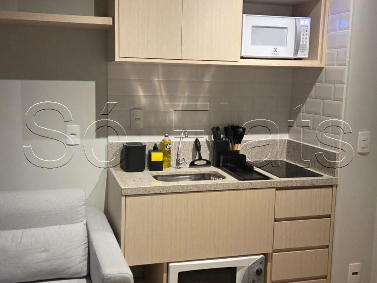 O apartamento com 30m² muito bem distribuídos em 1 dormitório, sala e cozinha americana.