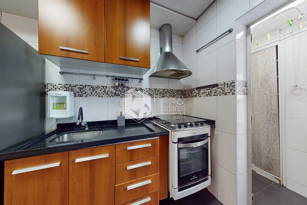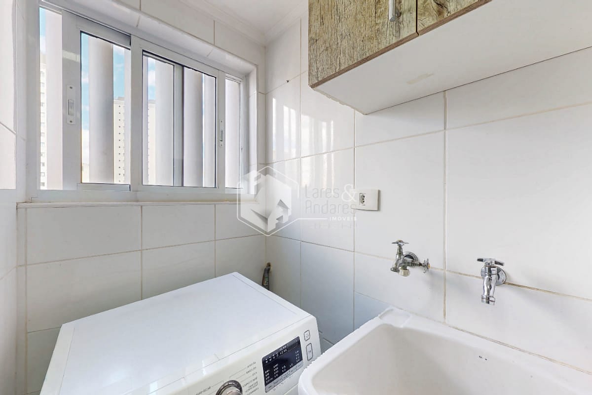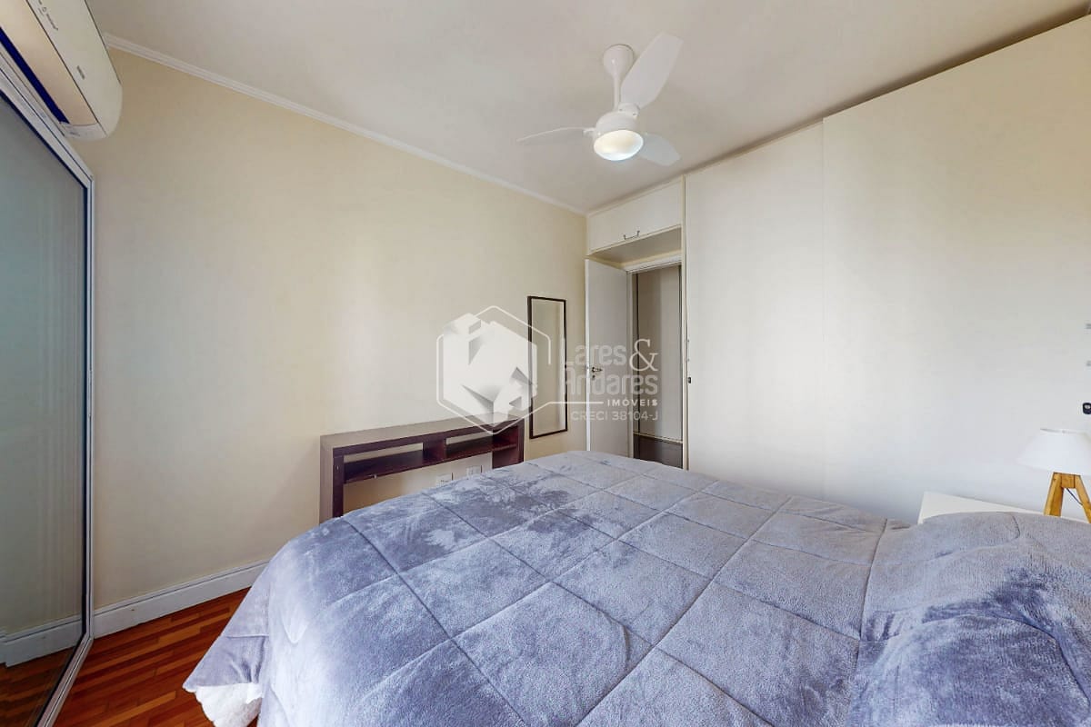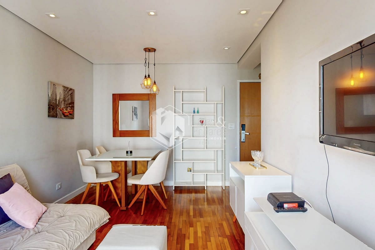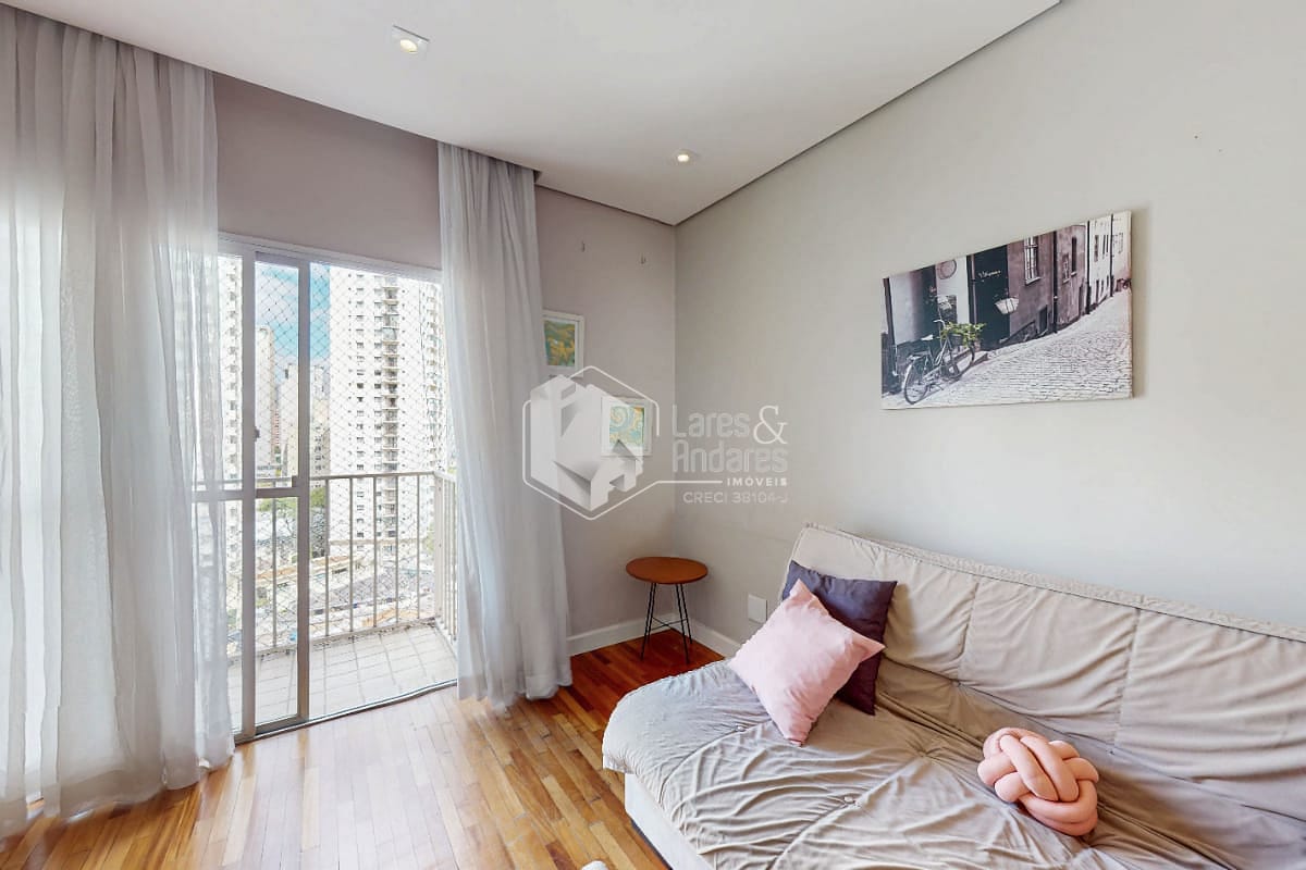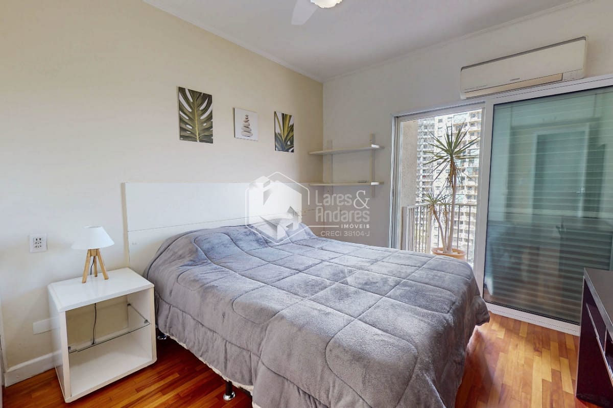 Possui um dormitório com varanda e ar-condicionado, banheiro, living com varanda, cozinha, área de serviço e uma vaga de garagem. O piso em madeira e os armários planejados valorizam os ambientes e trazem funcionalidade ao dia a dia.