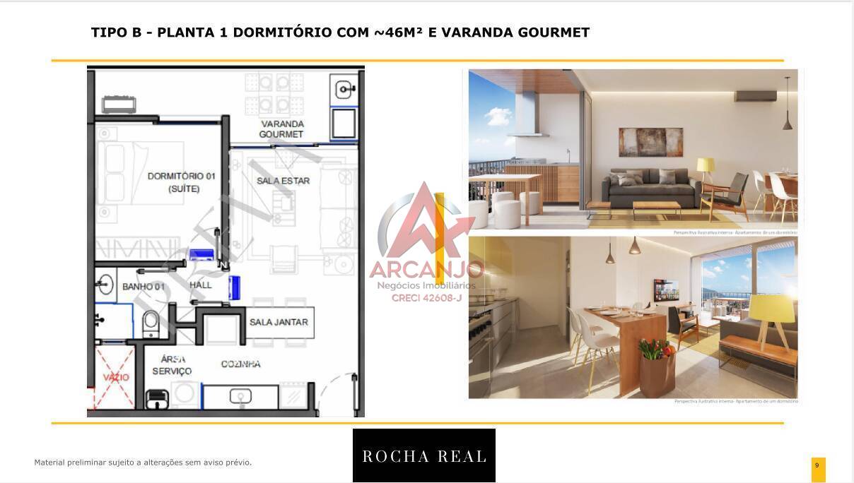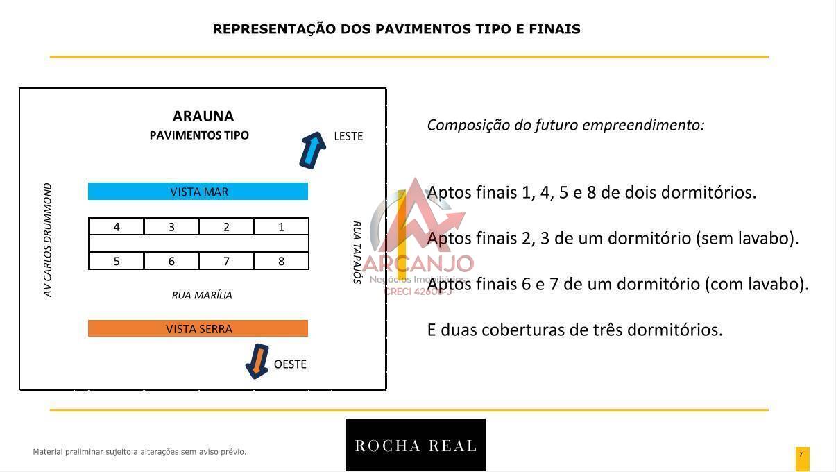 O empreendimento ARAUNA será composto por apartamentos de 1 e 2 dormitórios e 3 dormitórios, com área útil de 46m2 a 91m2, além de duas coberturas de 3 dormitórios. Com design diferenciado, ideal para: Futura moradia/ Aluguel de temporada / Férias (uso proprietário) Apartamentos com 1 ou 2 vagas de garagem.