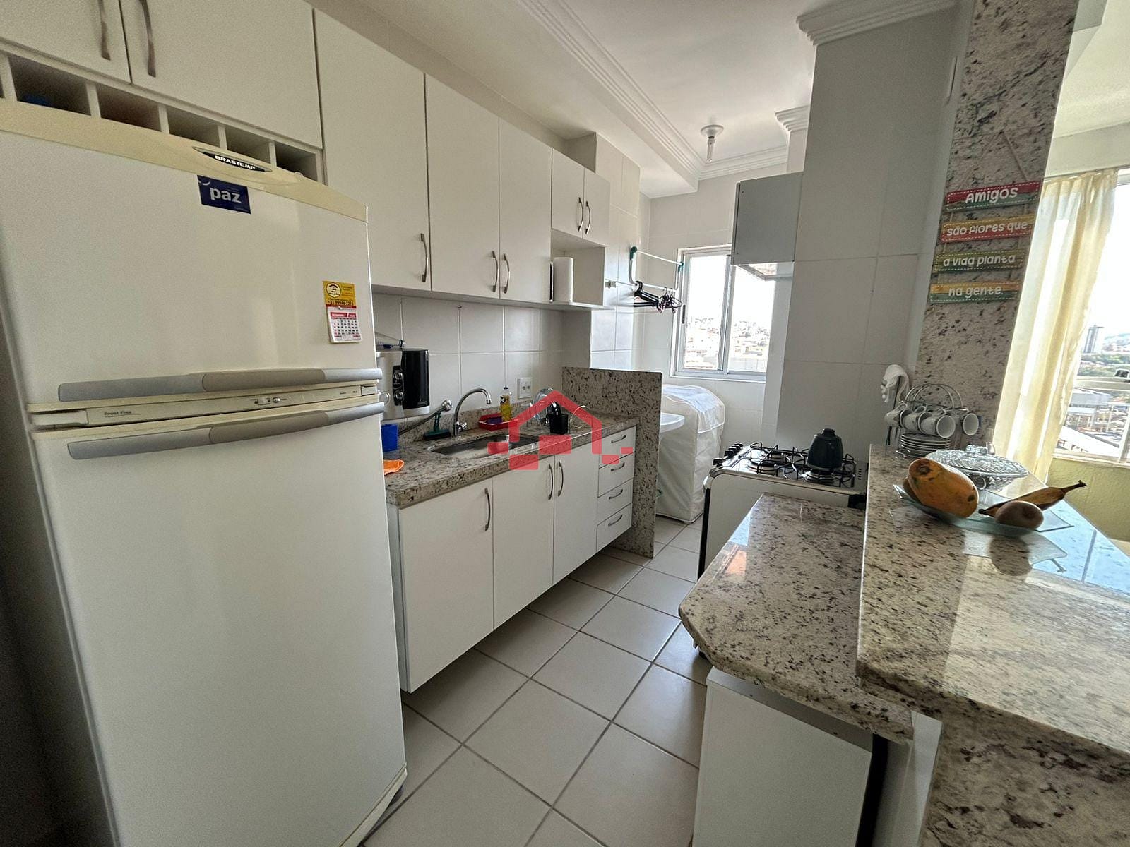 - 01 Cozinha com bancada em granito, armários e área de serviço integrada;