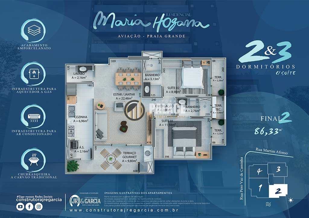 Apartamento à venda em Praia Grande, no bairro Aviação!Apartamento amplo, tem 86,33 metros de área útil, 02 Suítes, lavabo, sala ampla, sacada gourmet, cozinha, área de serviço e 01 vaga de garagem.Ligue agora e marque uma visita agendada com nossos corretores.