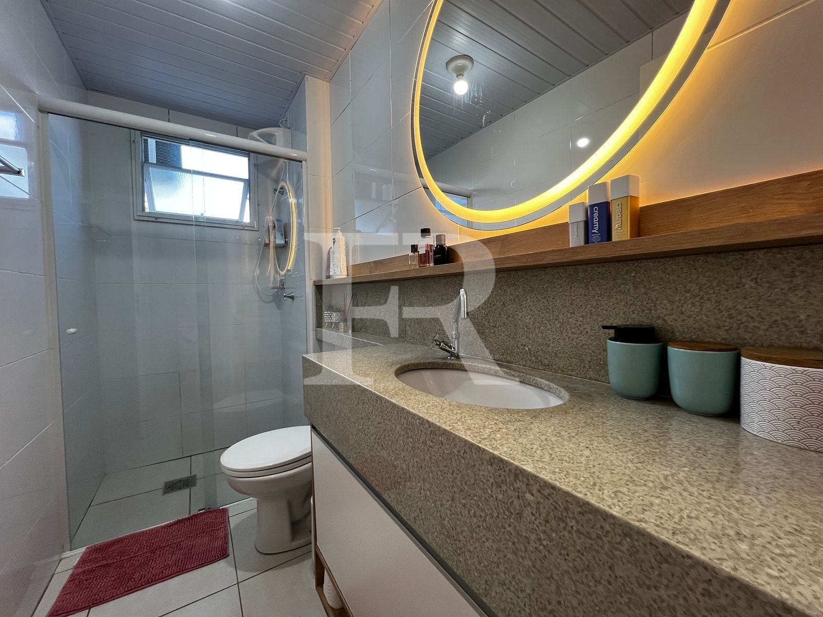 BWC com pia em mármore, armário sob medida.