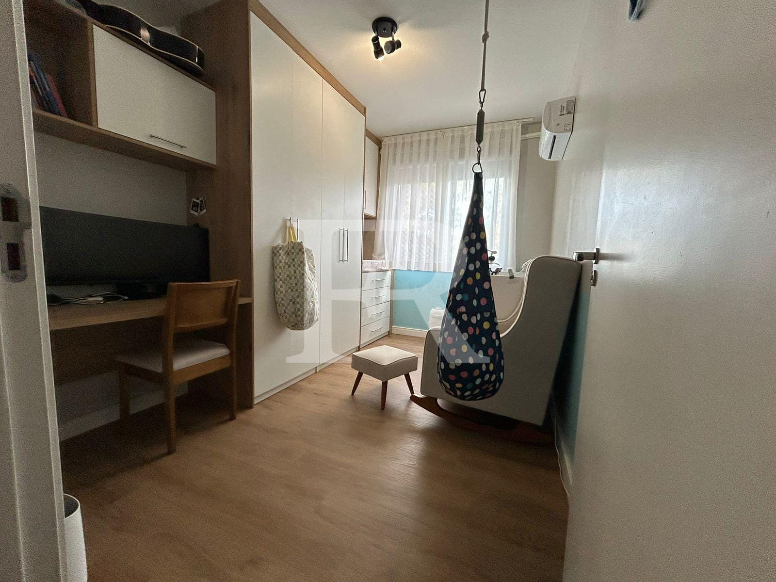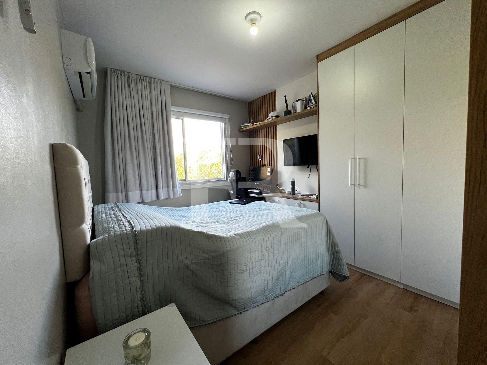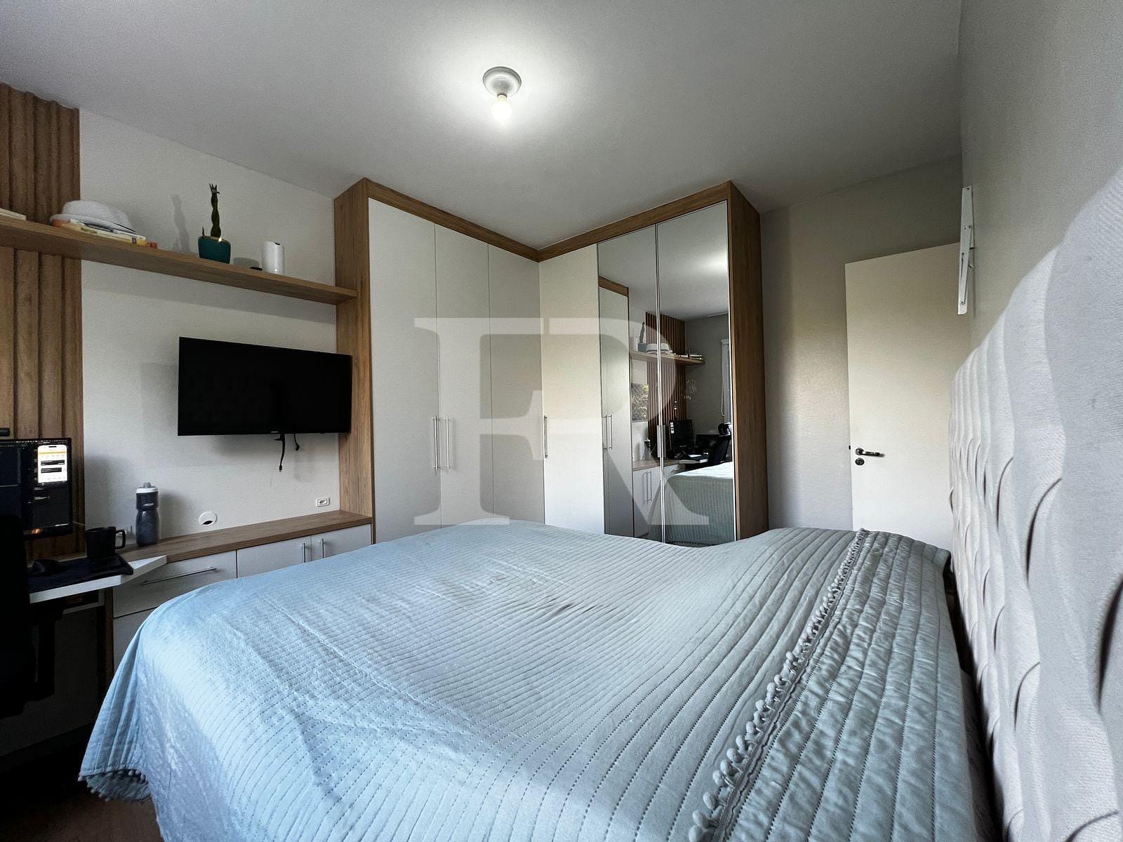 2 Dormitórios ( um dormitório com armários sob medida, ar-condicionado Split e bancada de escritório planejada; dormitório de casal com armários sob medida espelhado, ar-condicionado Split, painel de TV com gaveteiro, bancada de escritório planejada).