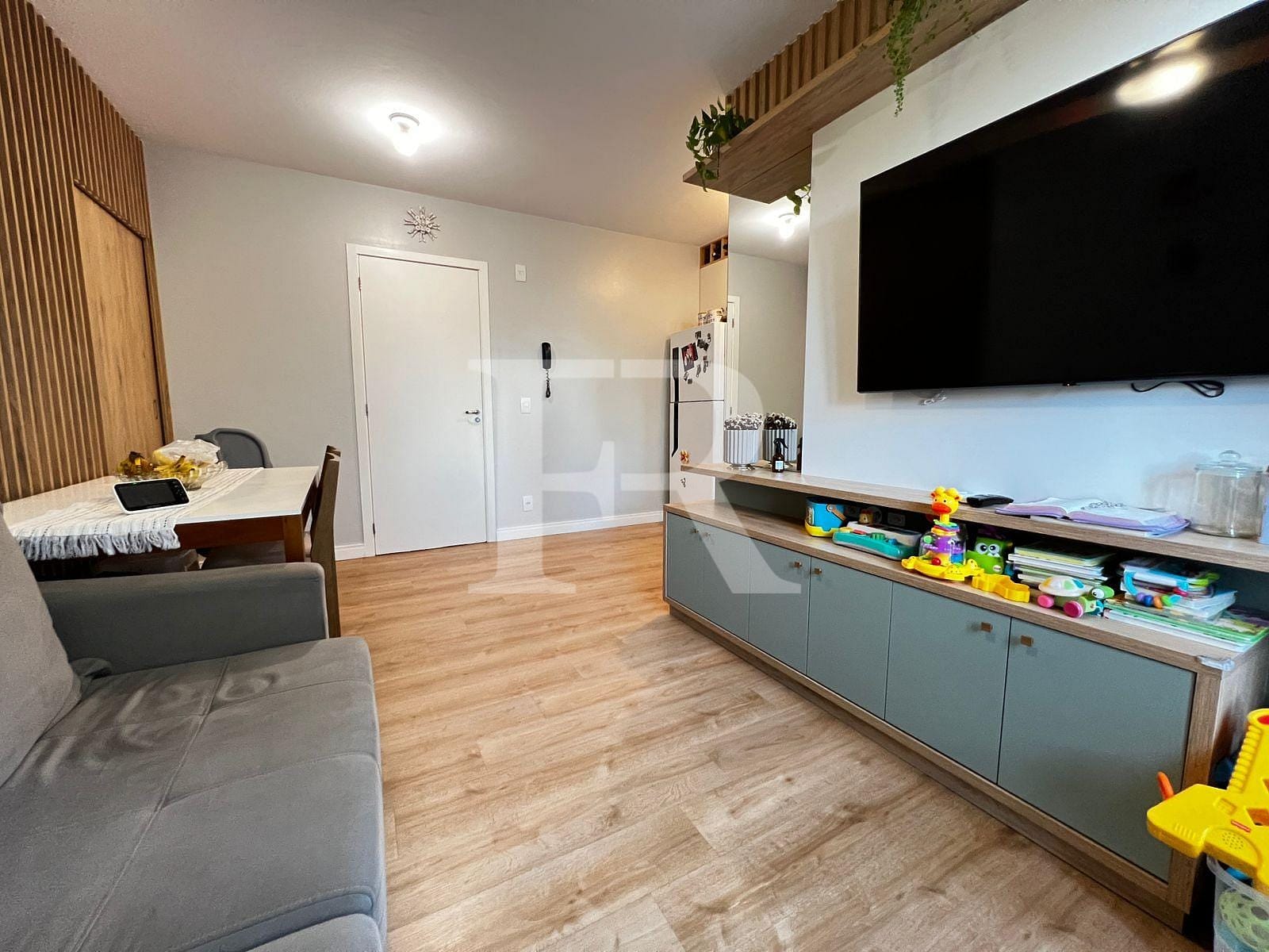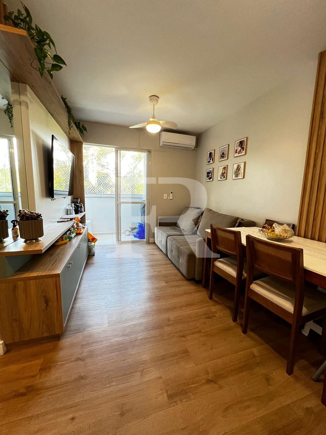 Sala de jantar/estar, paredes decoradas com espelhos e revestimentos, painel para TV, ar-condicionado;