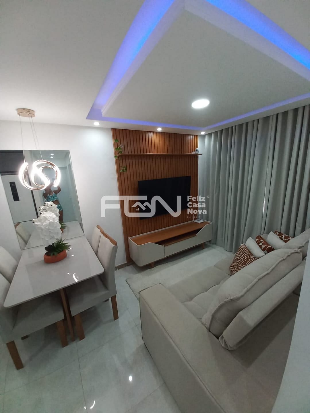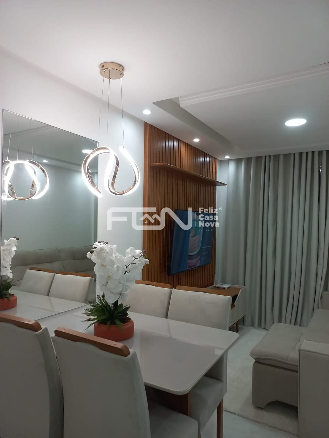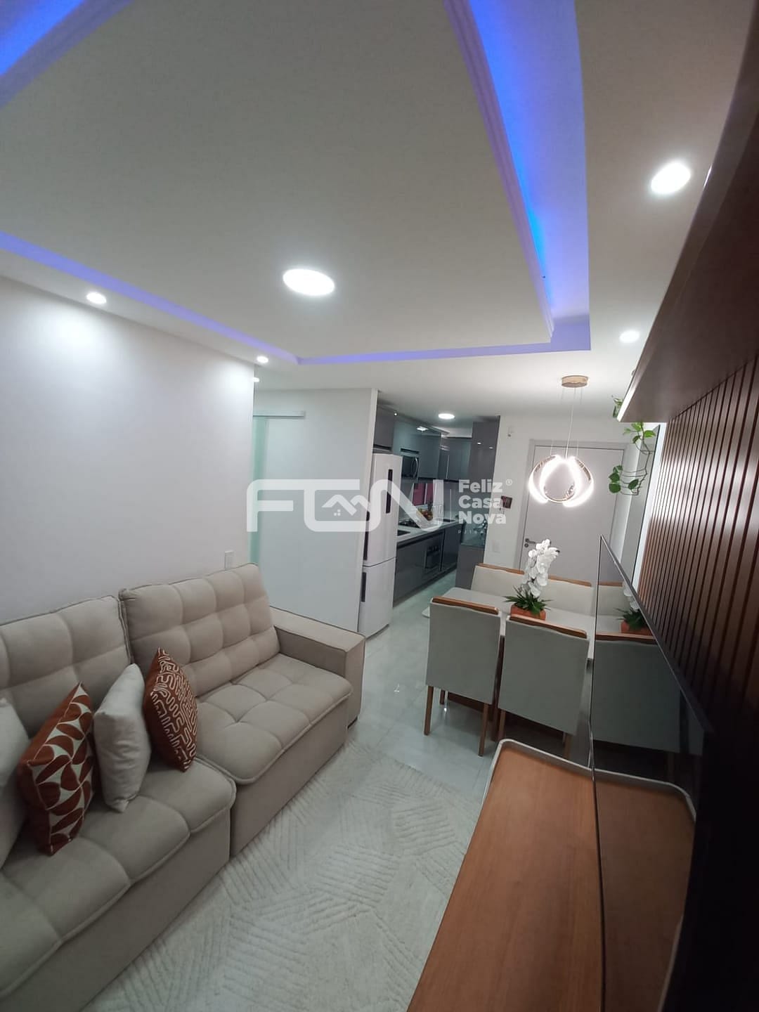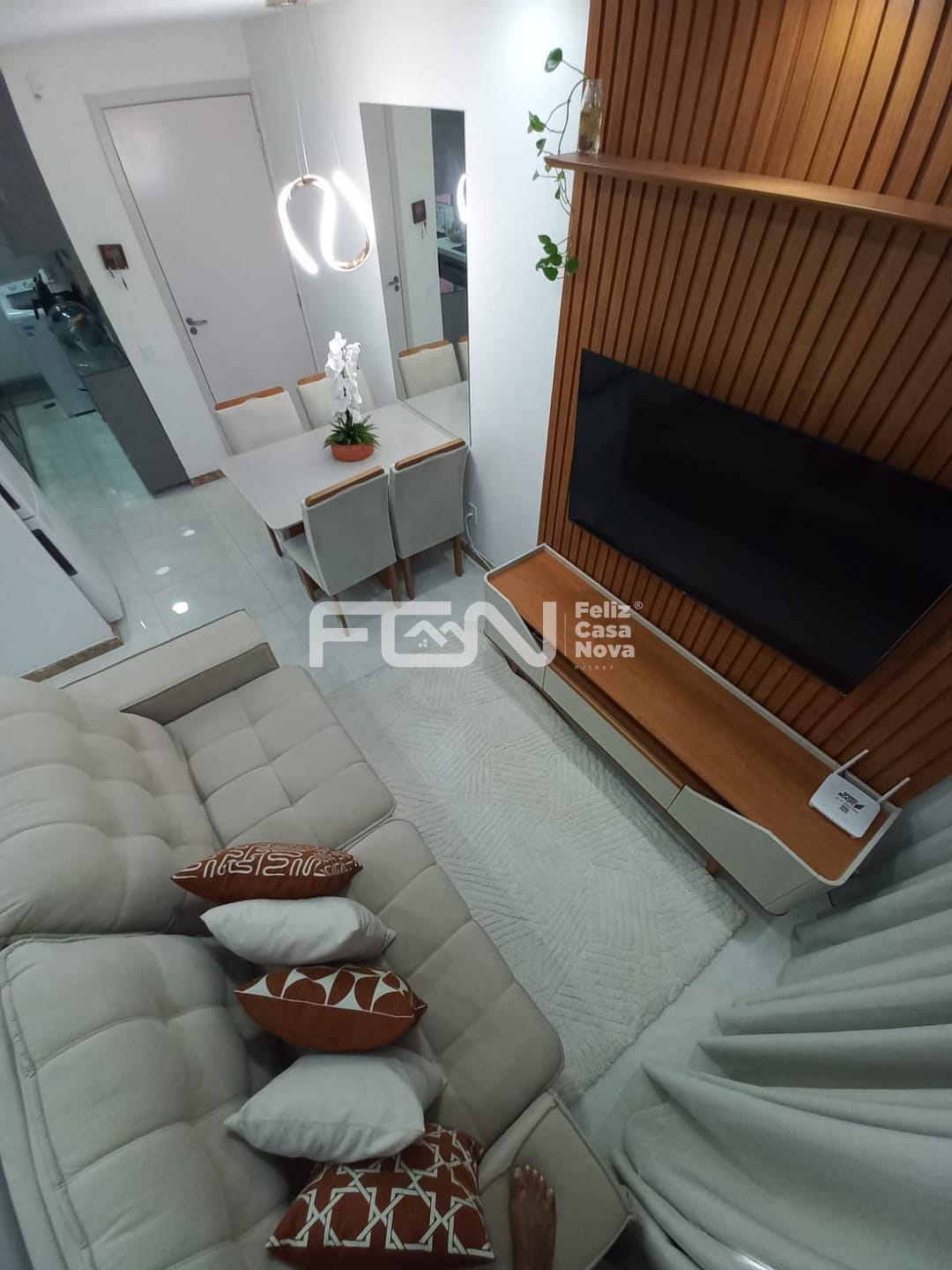 Sala: Sofá, painel de TV e mesa de jantar.