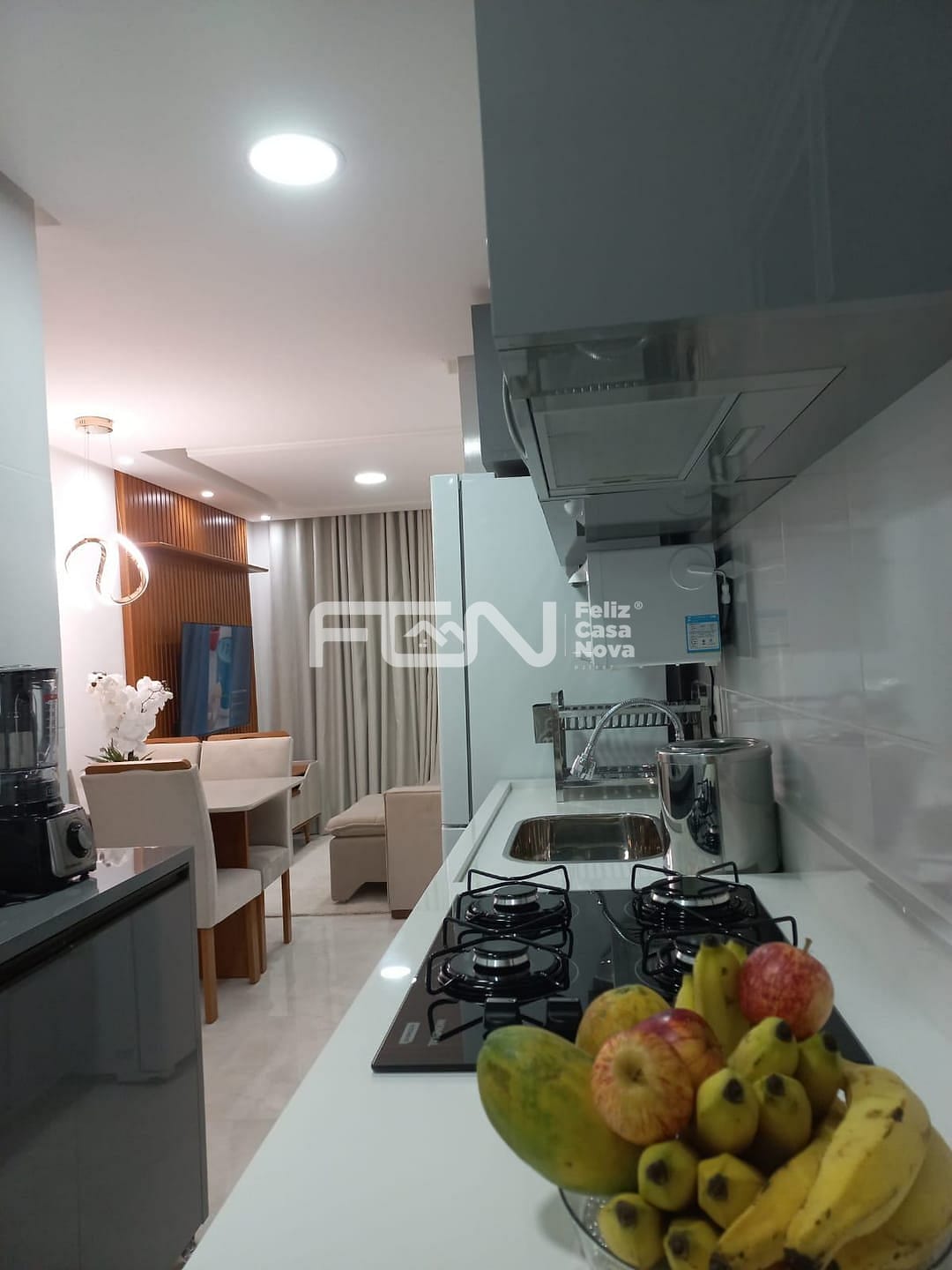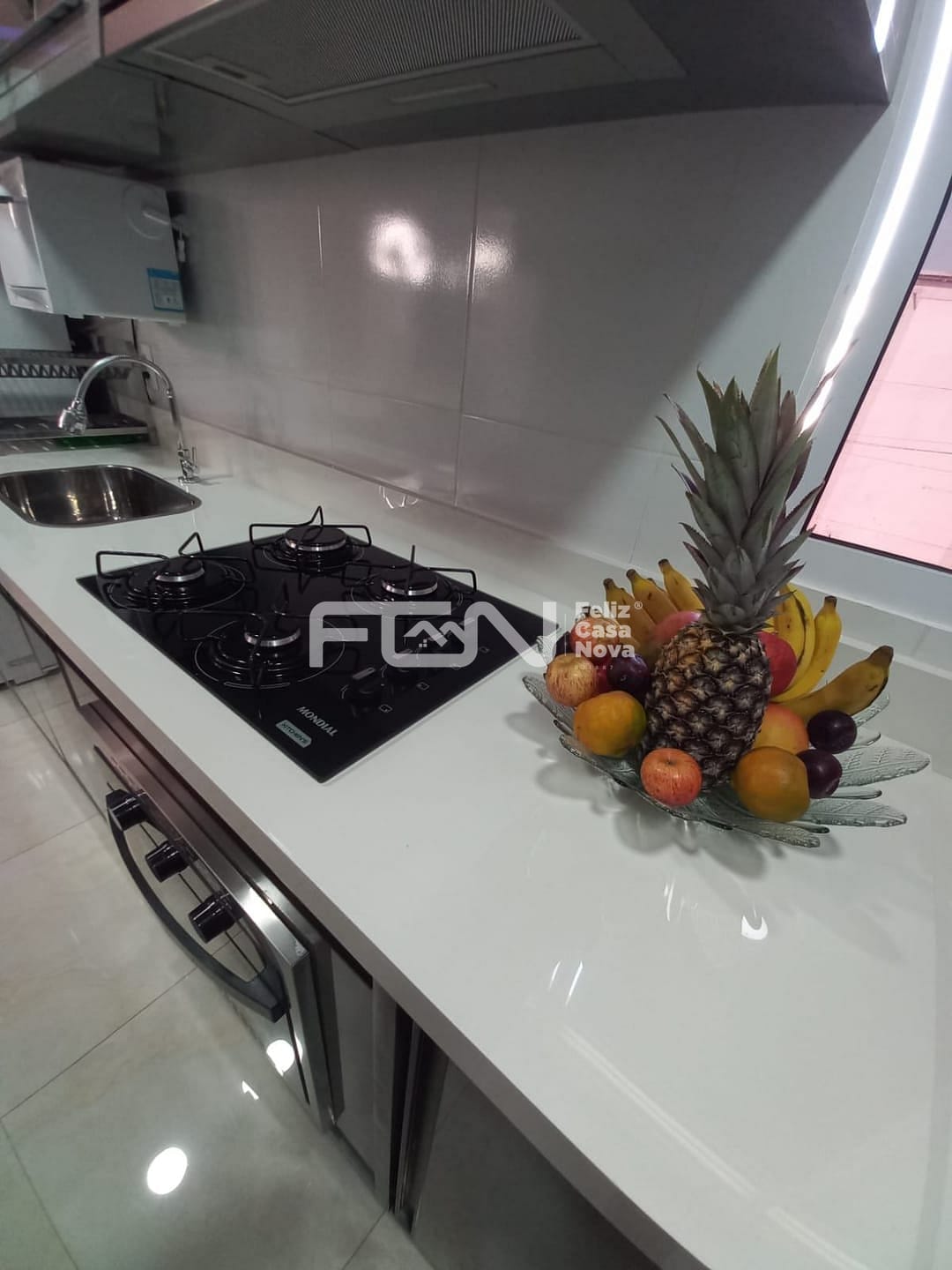 Cozinha: Planejada, equipada com cooktop e geladeira.