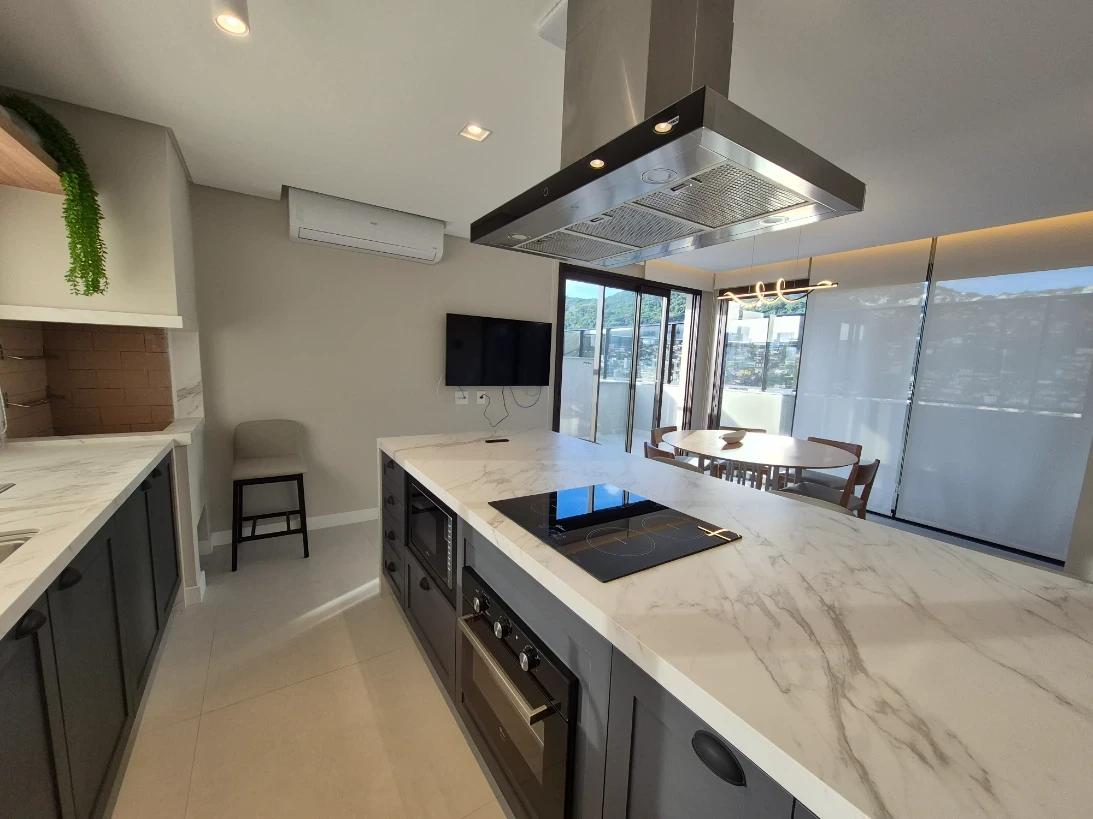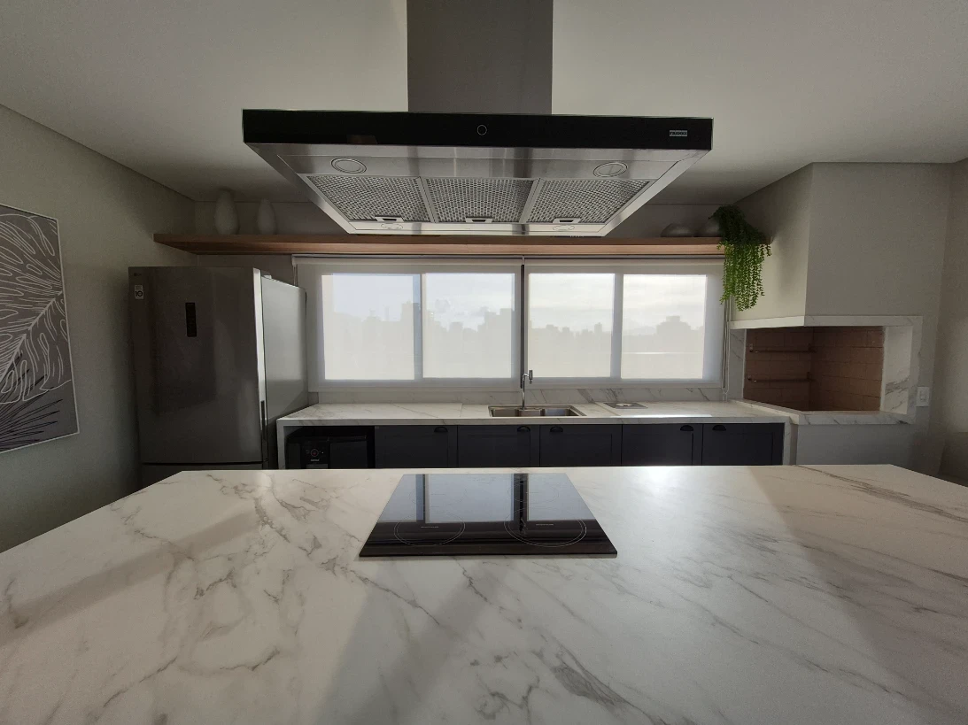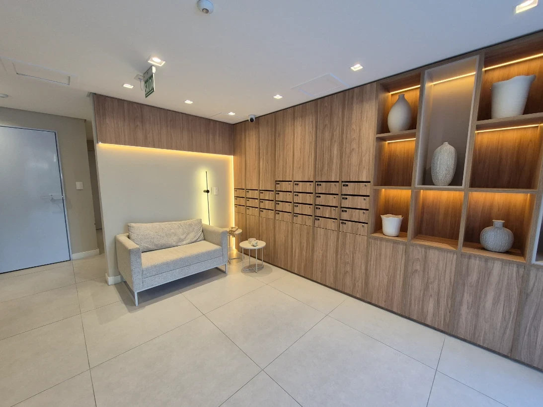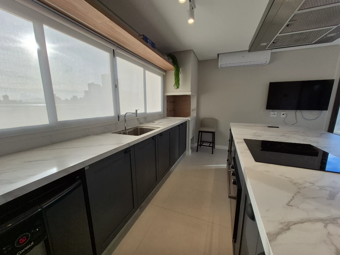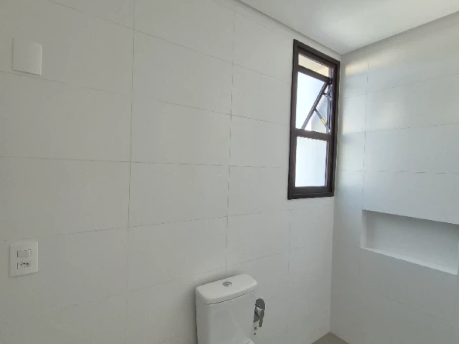 A unidade apresenta infraestrutura completa com água quente nas torneiras e chuveiros, proporcionando conforto aos moradores. Conta com área de serviço funcional, cozinha bem dimensionada e lavabo adicional, oferecendo praticidade para o dia a dia e para receber visitas.