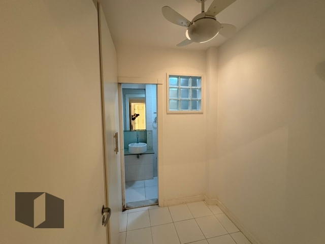 A antiga dependência de empregada foi inteligentemente adaptada: o quarto virou um escritório funcional, e o banheiro da área de serviço foi transformado em banheiro social, resultando em dois banheiros completos e um layout mais amplo e moderno.