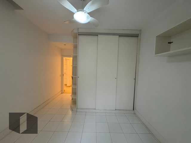 O primeiro quarto com guarda-roupa embutido e ventilador de teto.