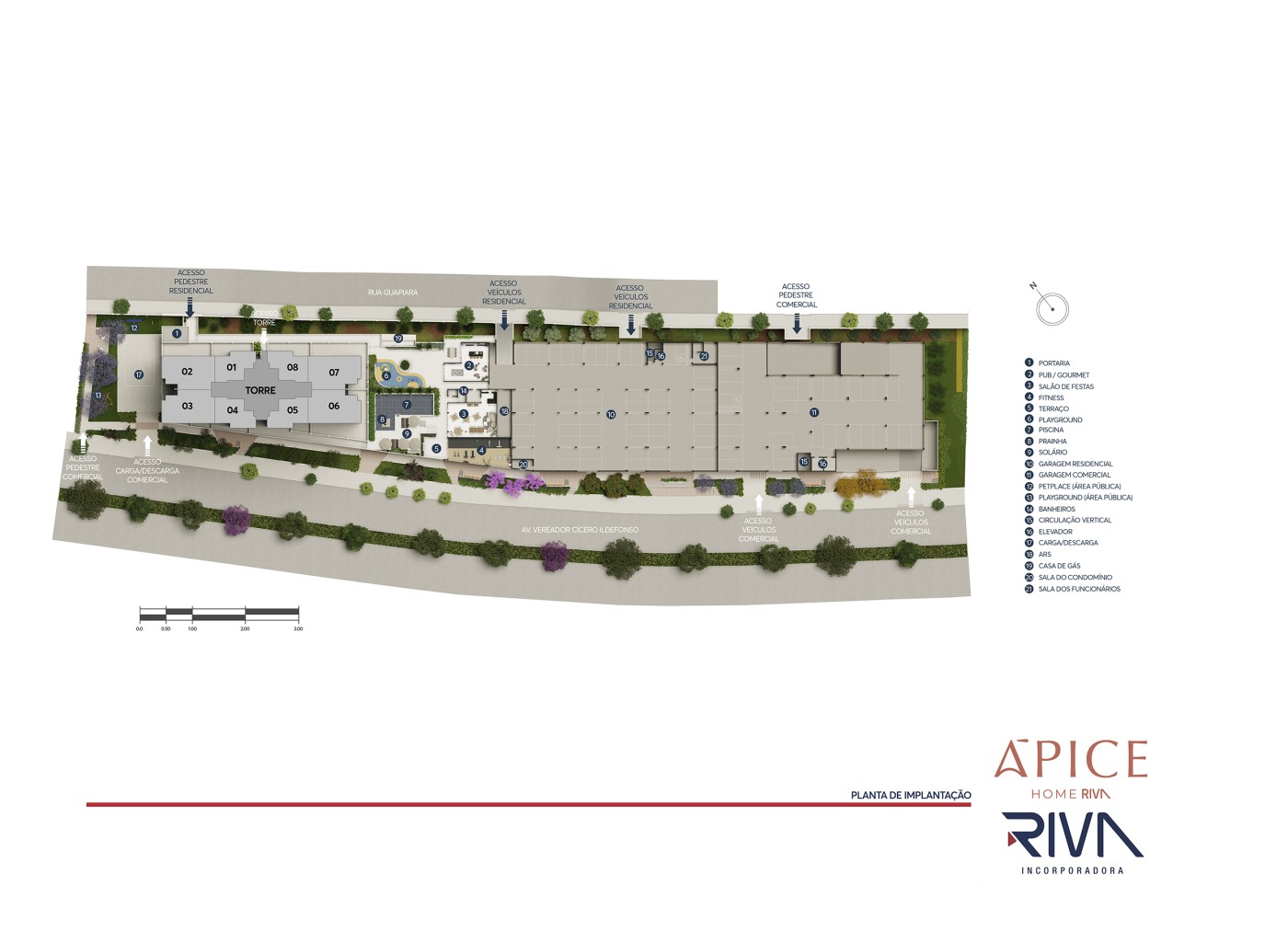 Vagas de garagem: 184 residenciais (3 PCD) + 75 comerciais