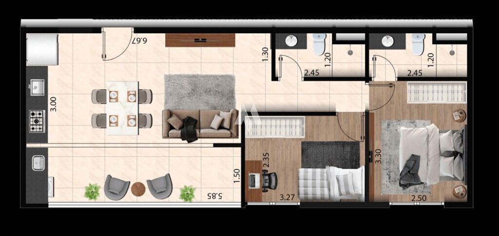 O apartamento de 59,57M2 apresenta espaços planejados para o dia a dia com praticidade.