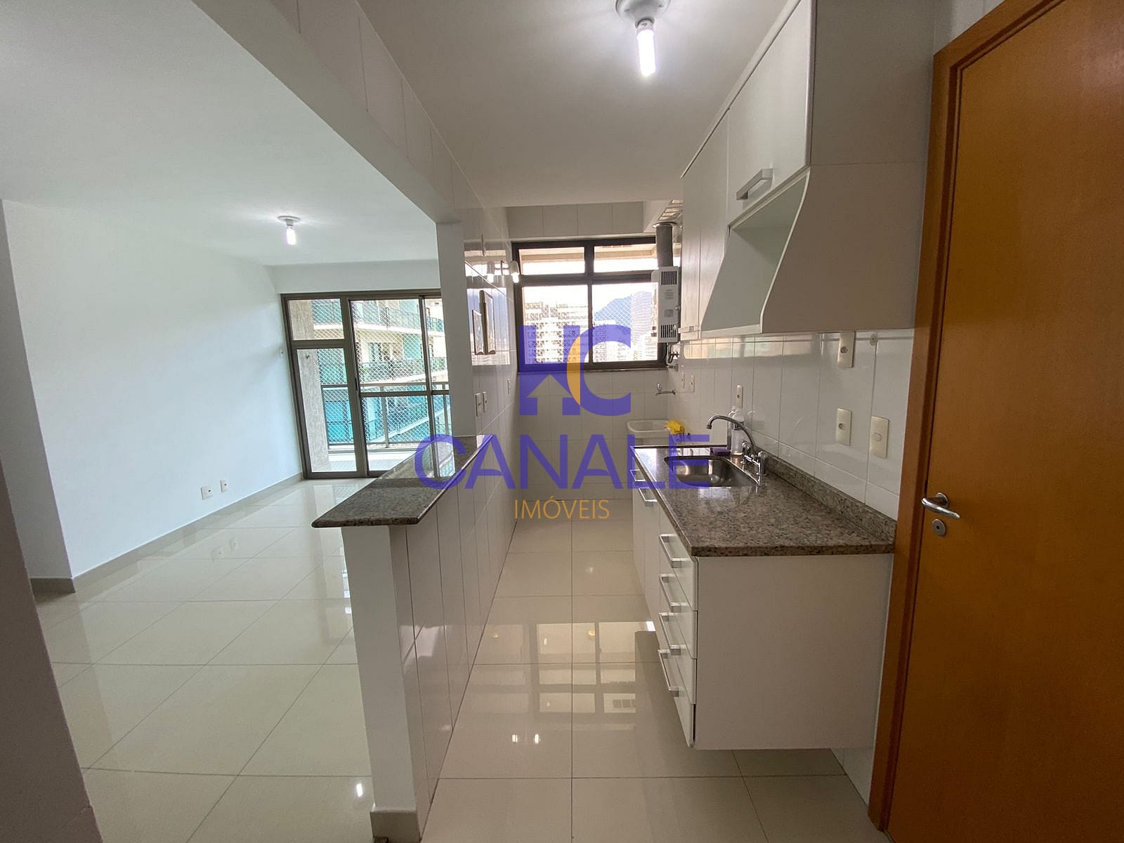 Cozinha americana com armário e bancada em granito,