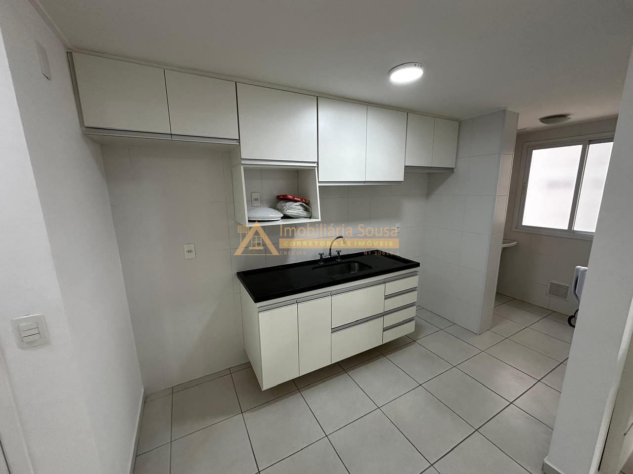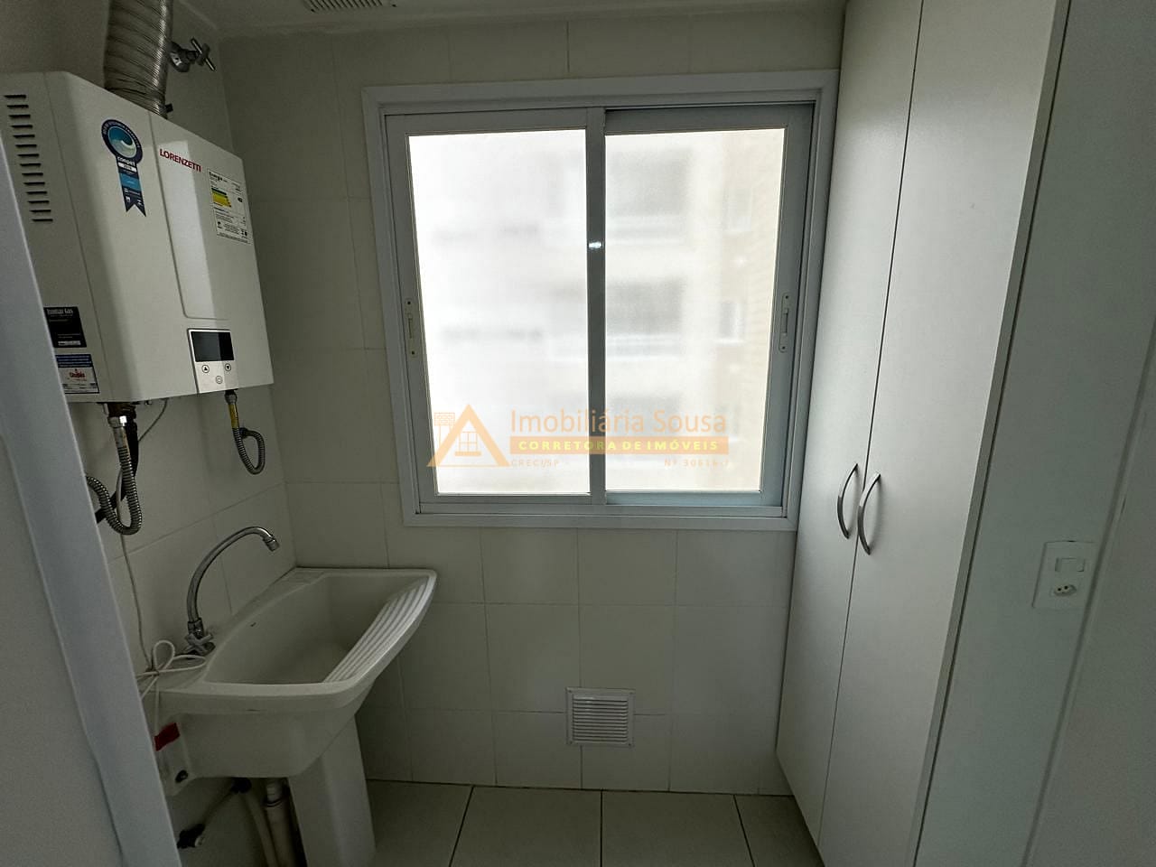 Lavanderia Prática: Área de serviço com armários embutidos, facilitando a organização dos utensílios de limpeza e otimizando o espaço.