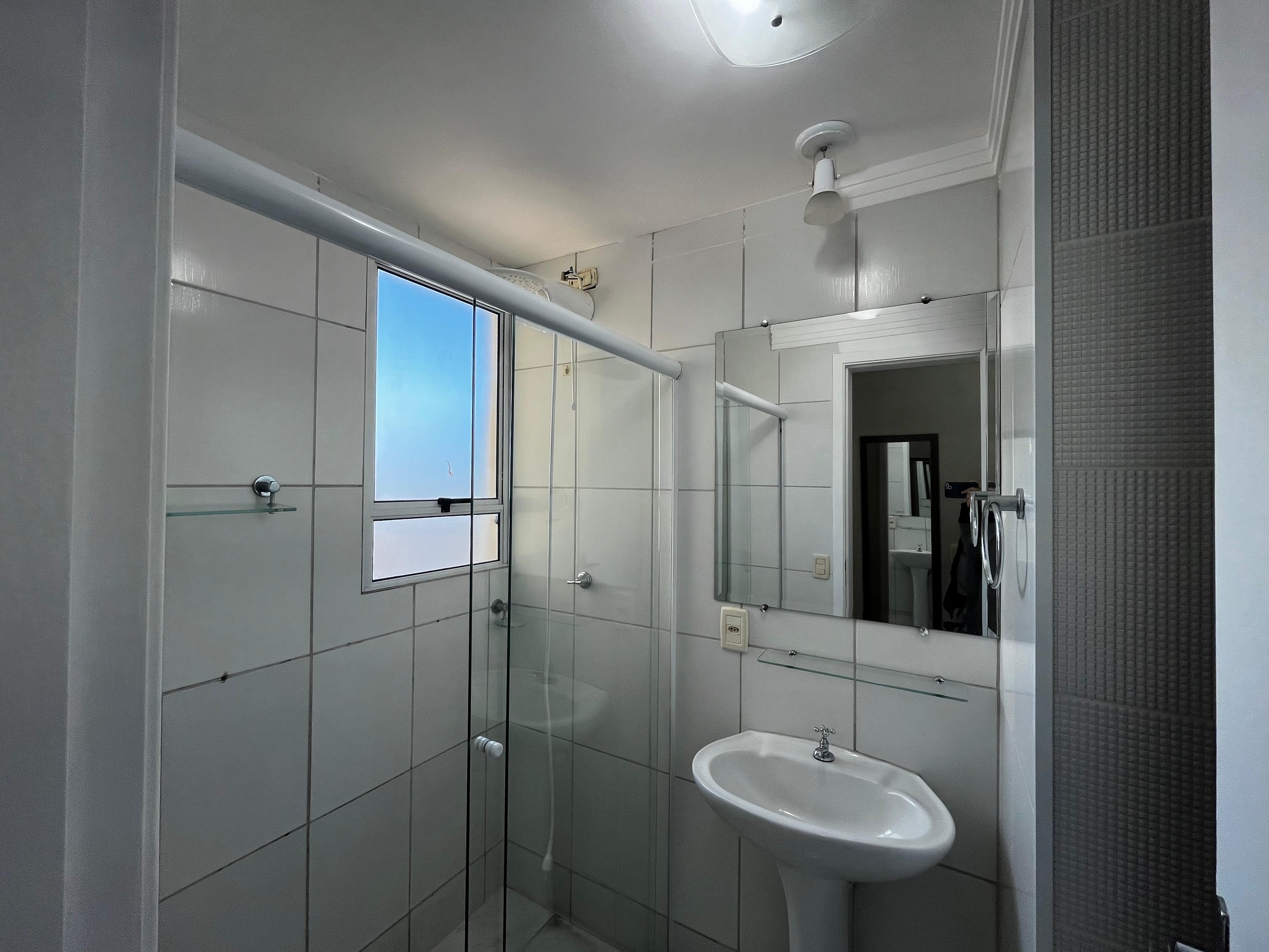 - Banheiro: Com chuveiro, box em blindex, gabinete e armário.