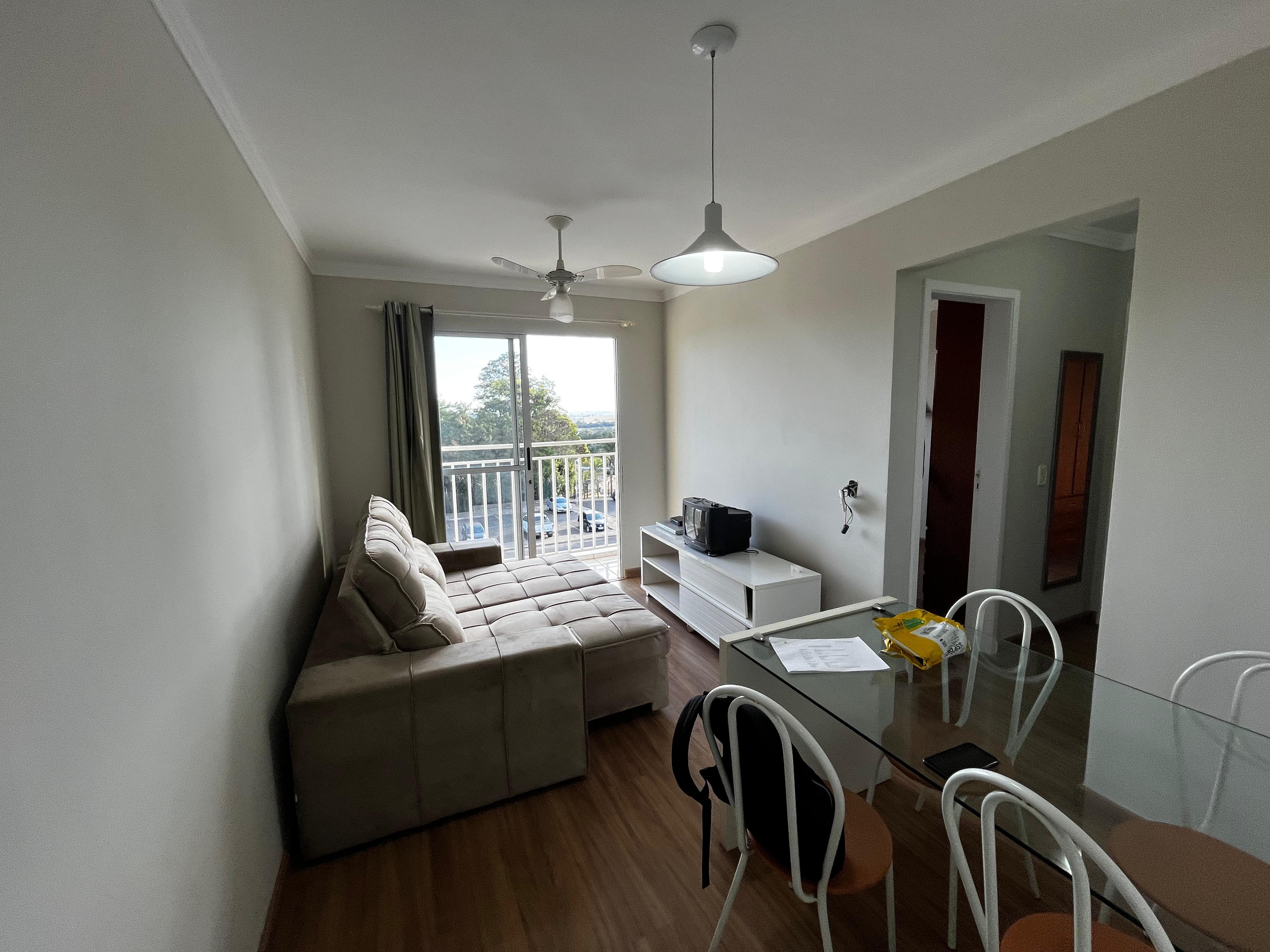 - Sala: Ambiente acolhedor com mesa para 4 pessoas, sofá, raque, ventilador de teto, TV, internet, cortinas, lustre e piso laminado.