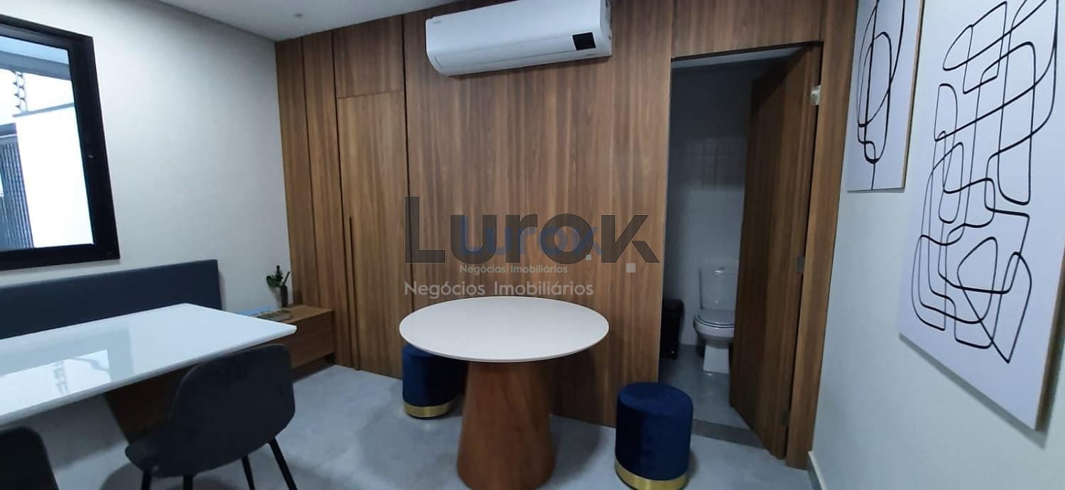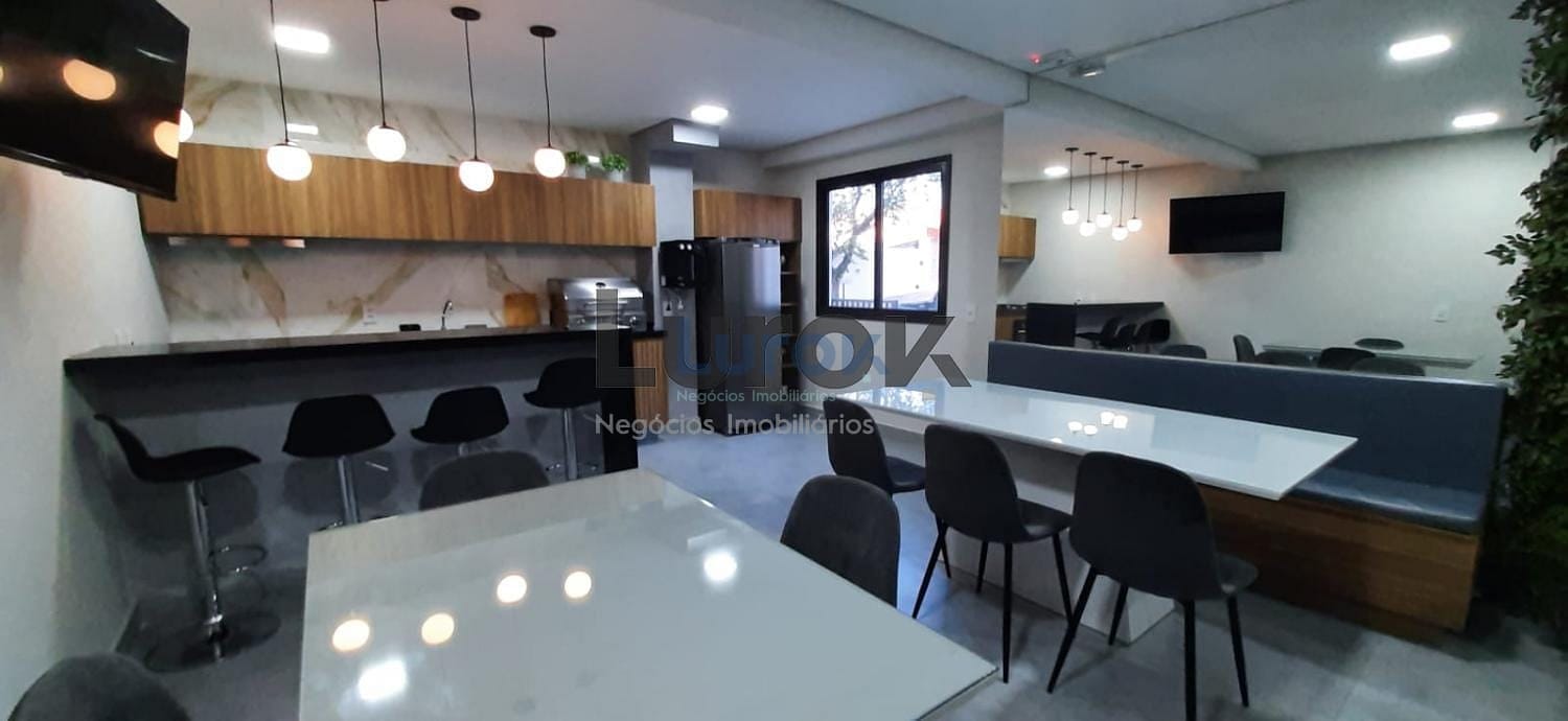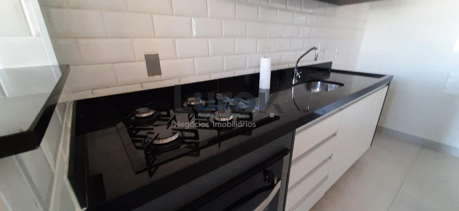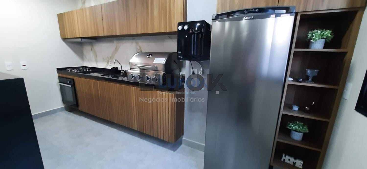 A cozinha é do tipo americana, equipada com armários, cooktop e forno. O imóvel ainda dispõe de banheiro social, área de serviço e 2 vagas de garagem.