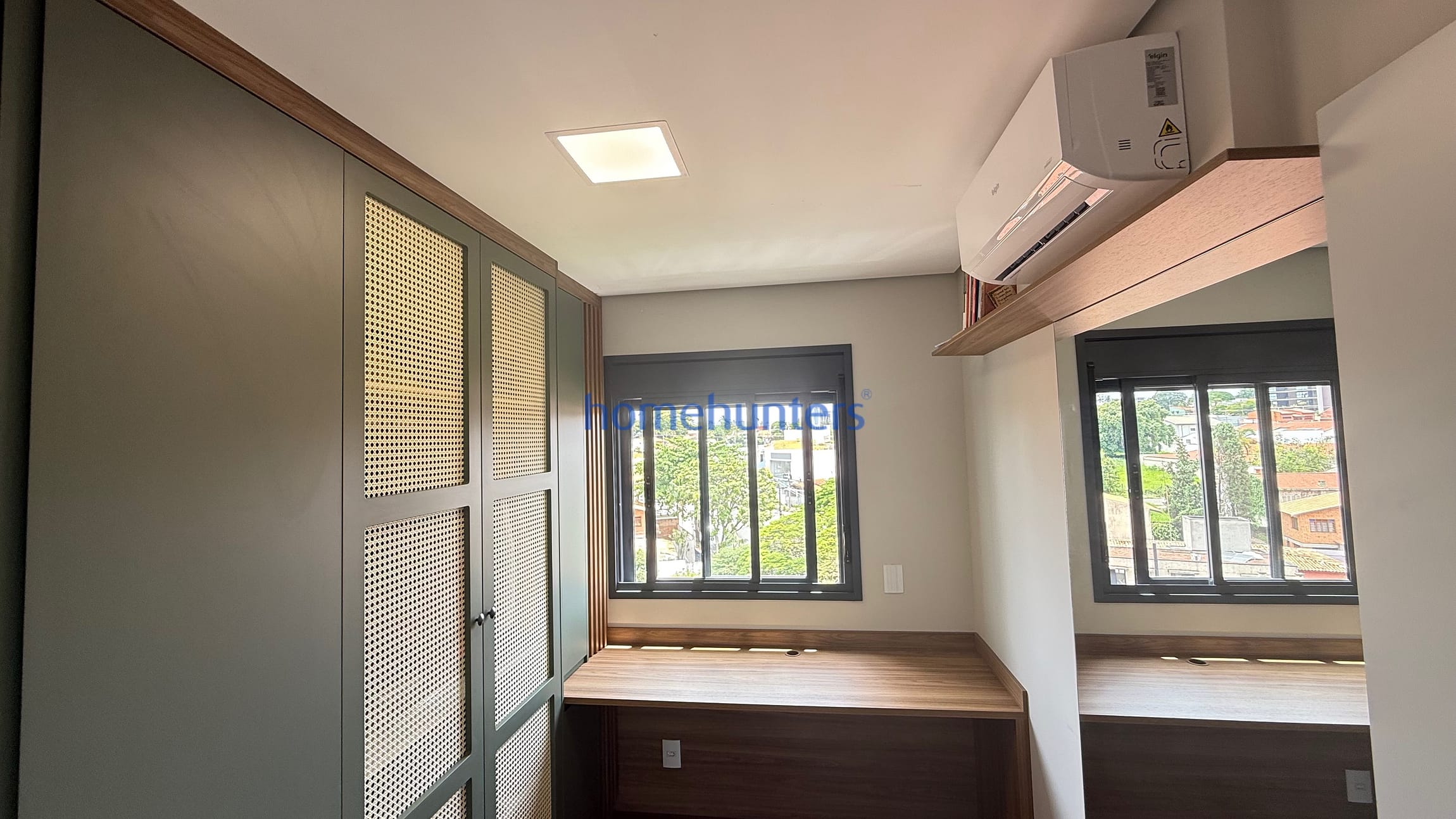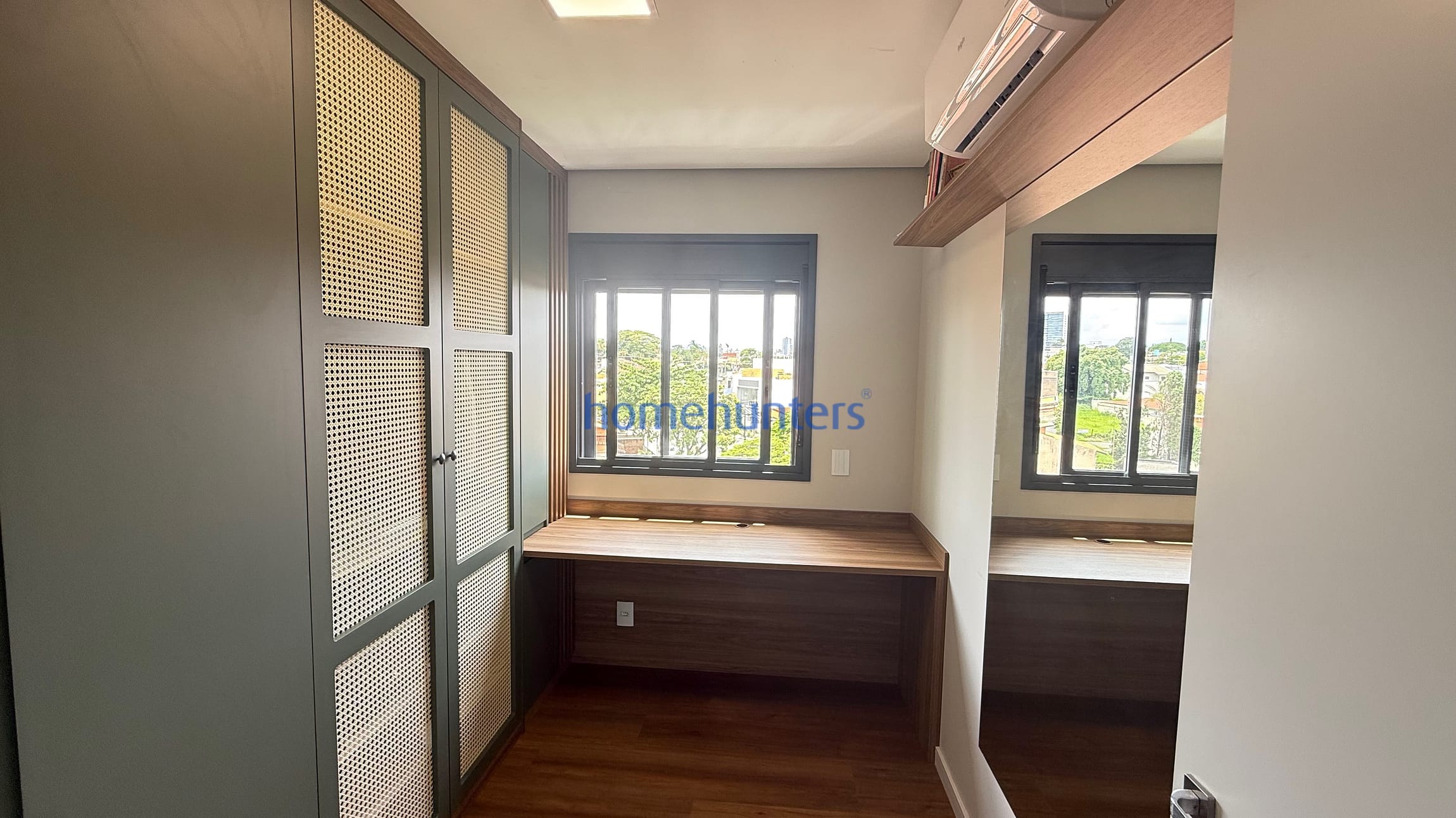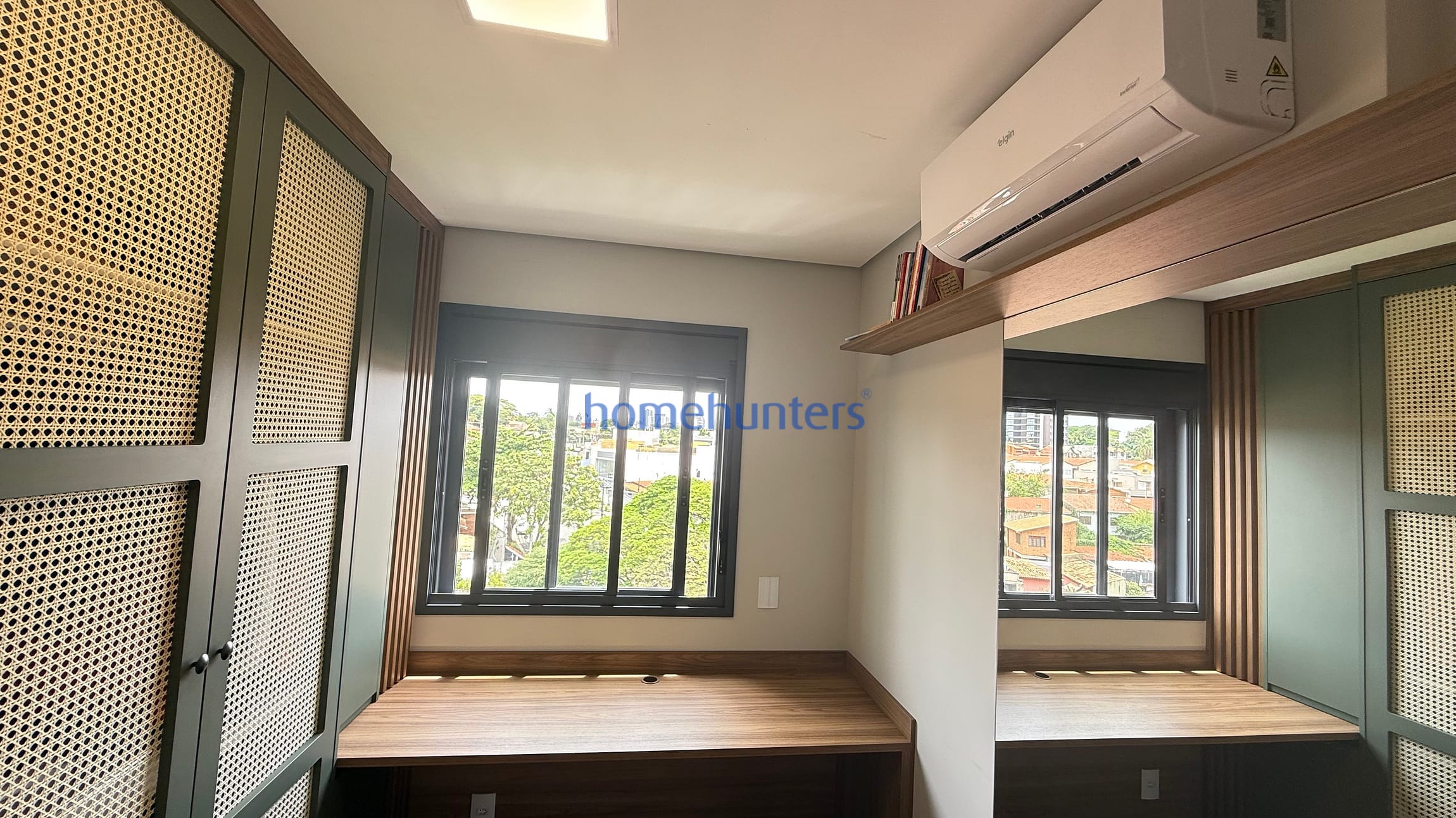 2 quartos com ar-condicionado e armários planejados sendo 1 suíte com cama box.
