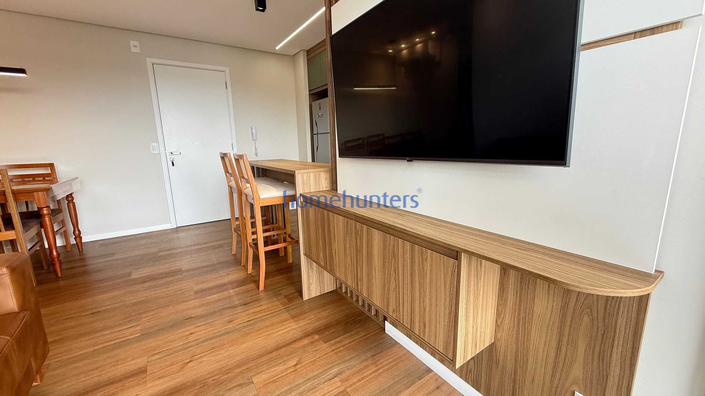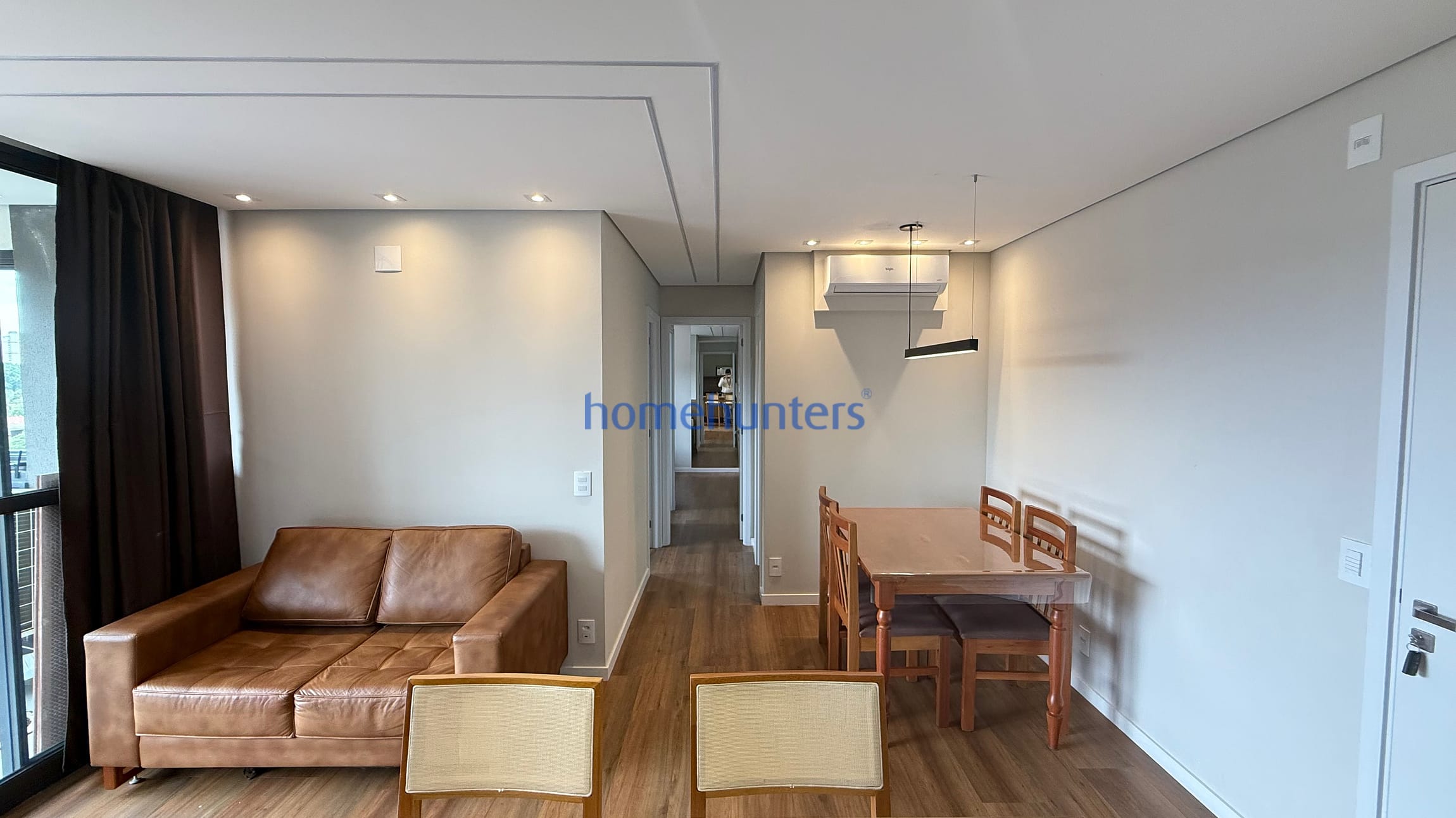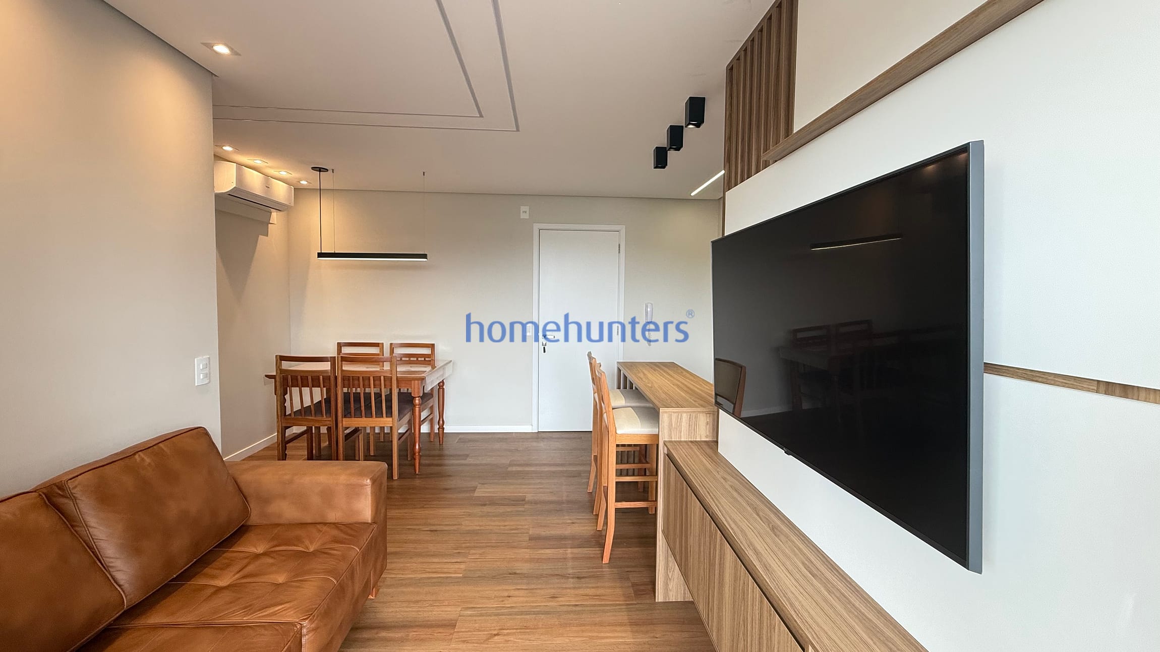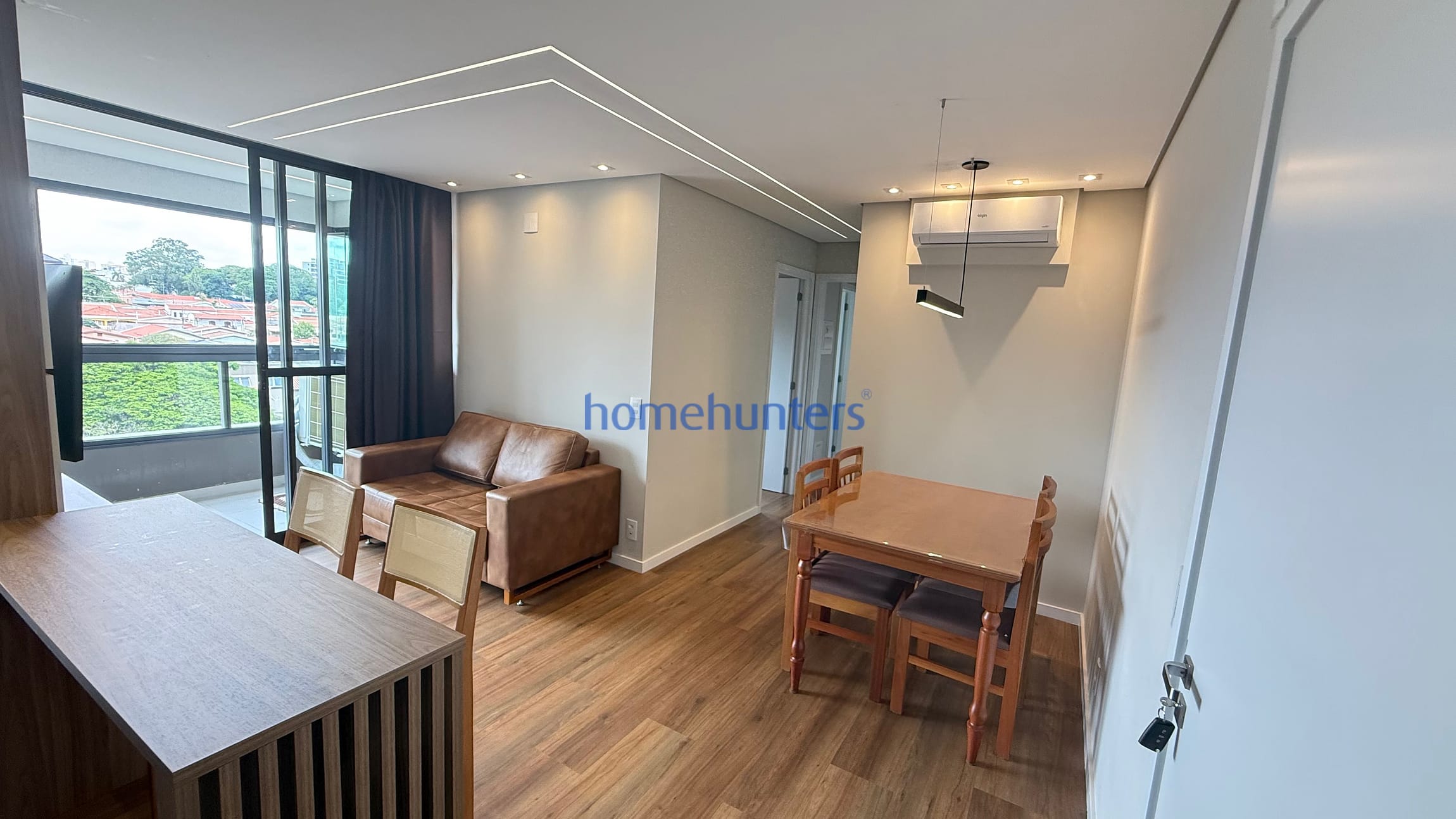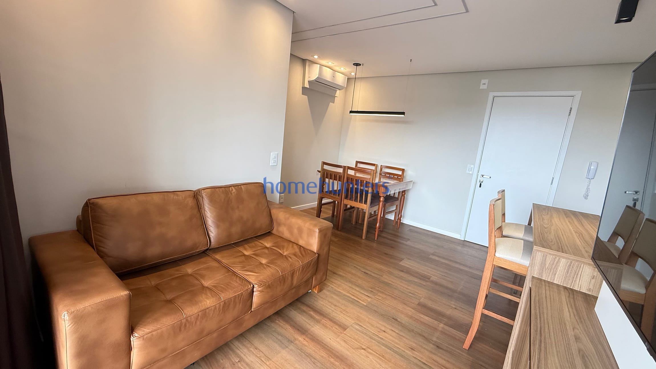 Living para 2 ambientes com sofá, mesa, banquetas, ar-condicionado e boa iluminação natural