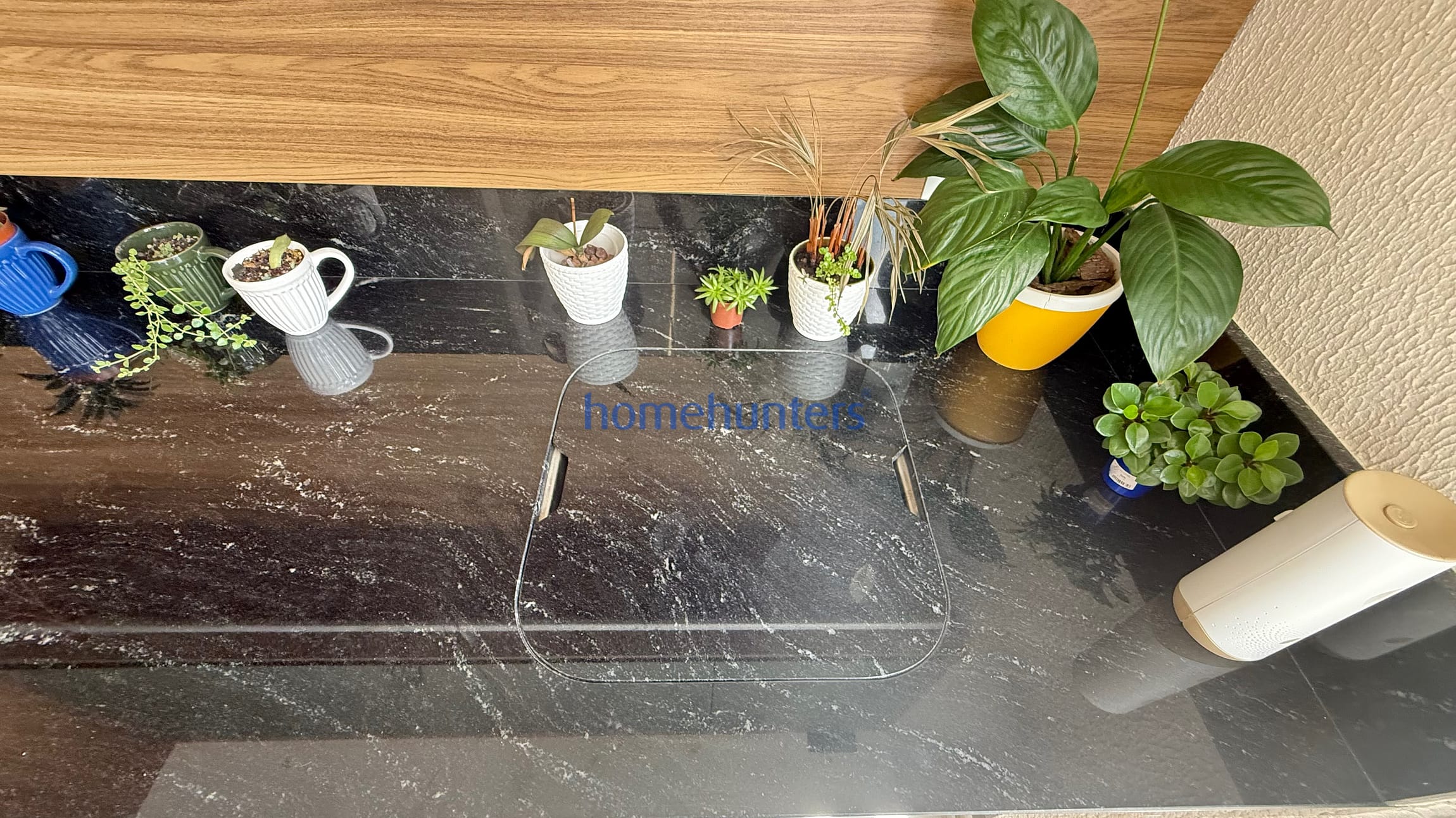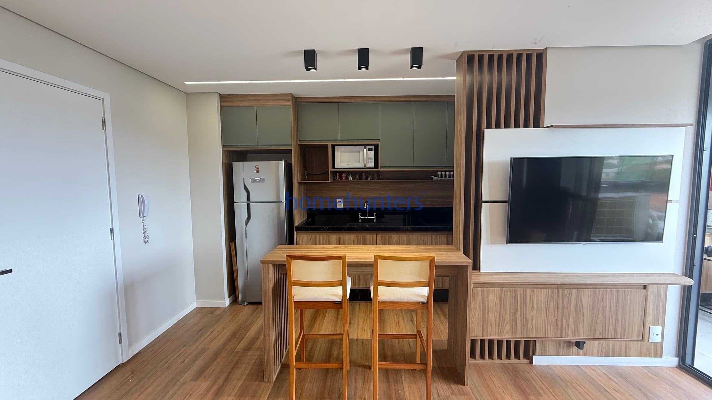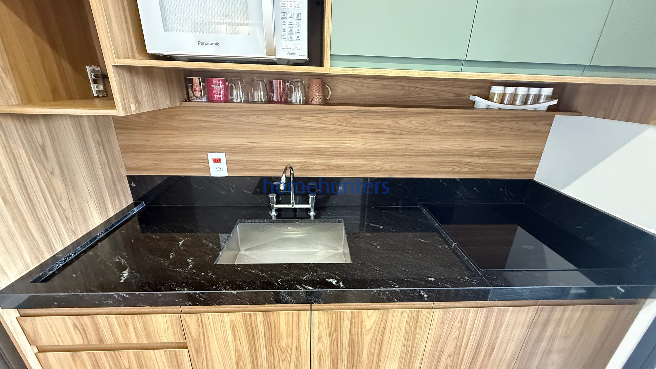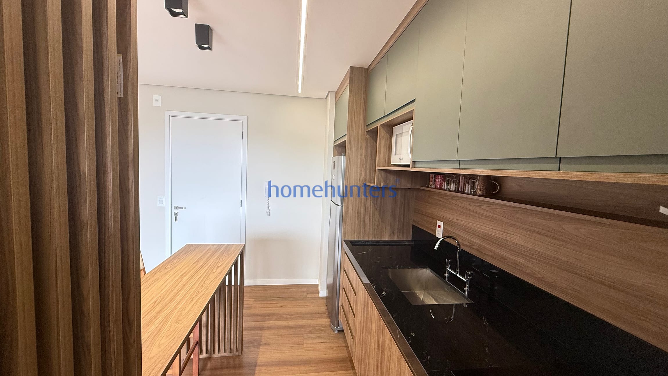 Cozinha planejada com cooktop, microondas, geladeira frost free e maquina lava e seca.