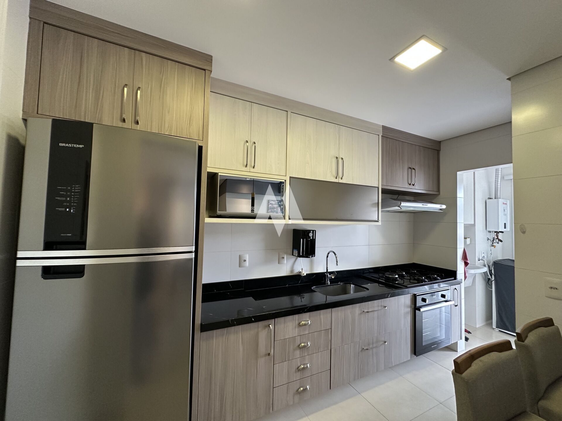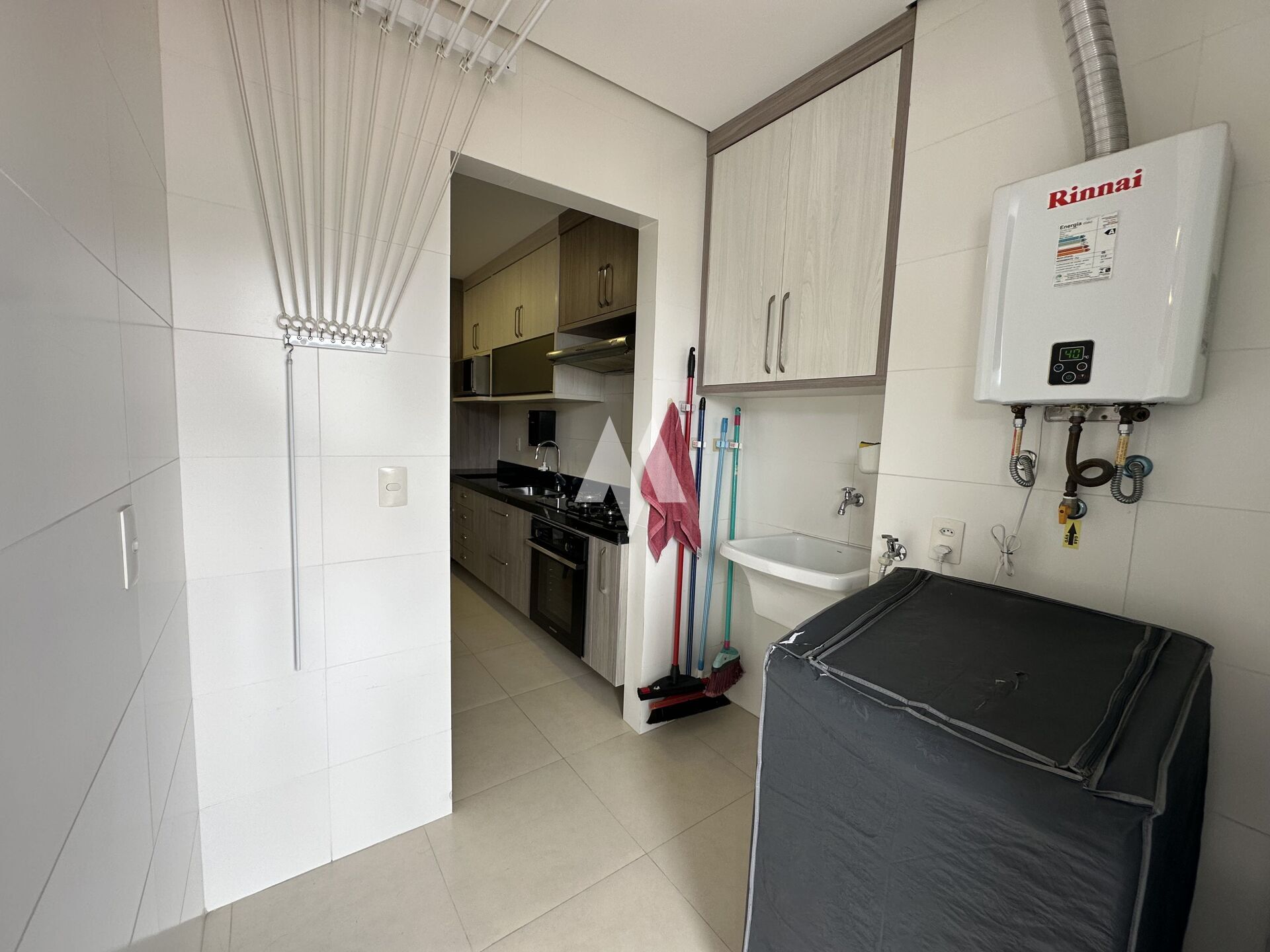 A cozinha americana é funcional e já equipada, enquanto a área de serviço, independente, garante maior comodidade no dia a dia.