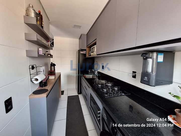 São 2 dormitórios sendo 1 suíte, 1 wc social, cozinha e área de serviço com planejados, living 2 ambientes com sacada e 1 vaga de garagem.