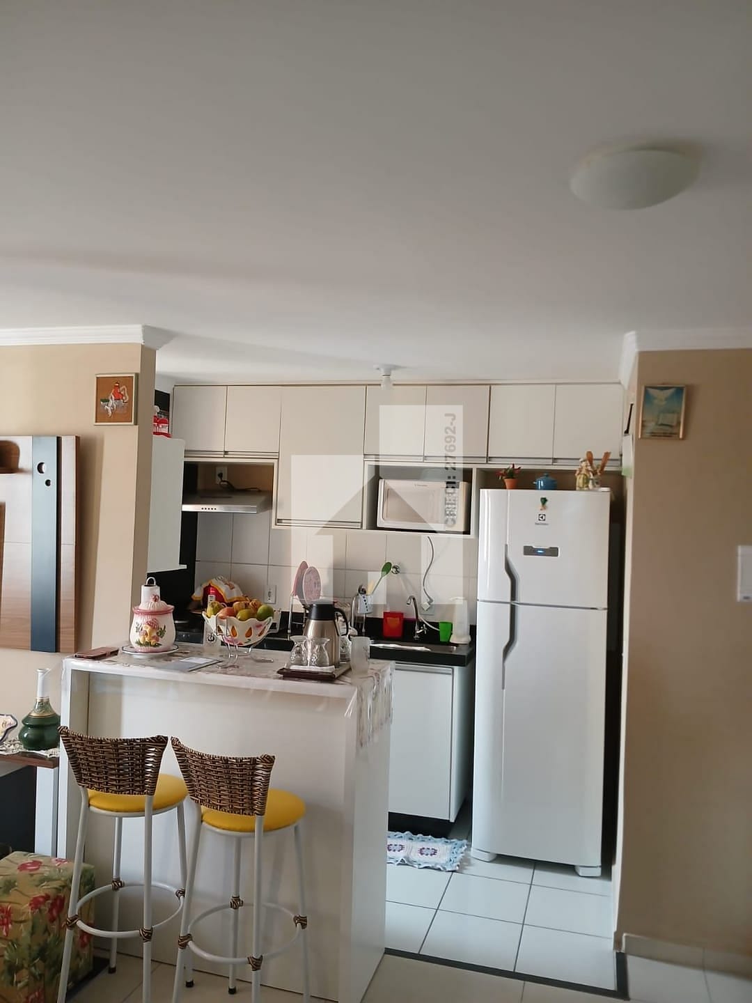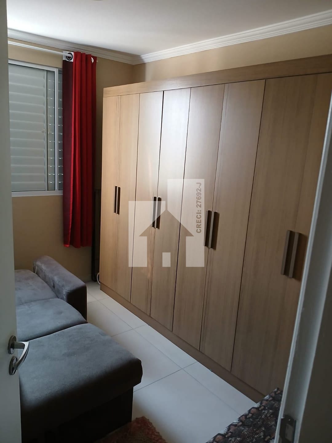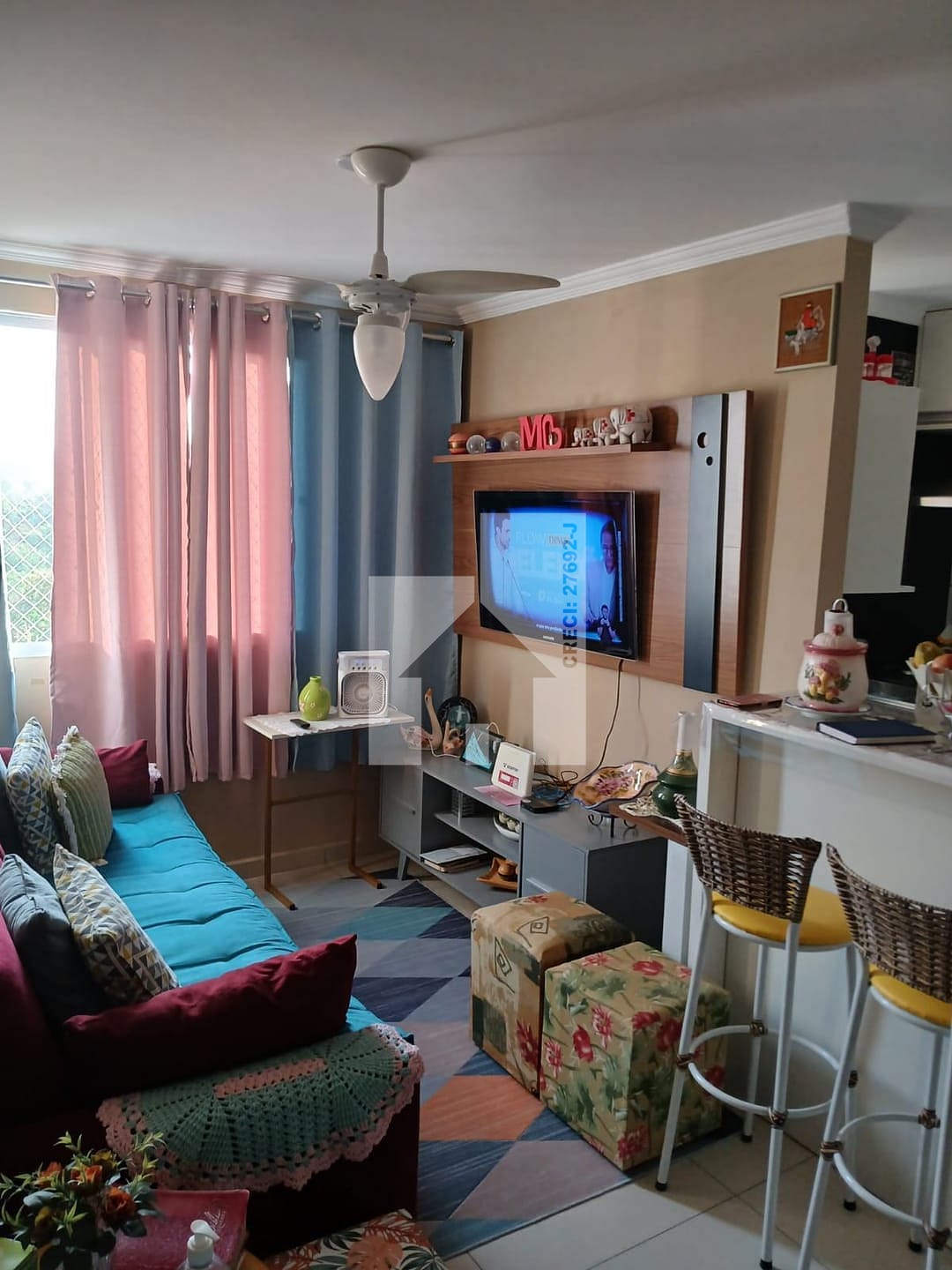 O apartamento possui 2 quartos, porcelanato nos pisos. A cozinha conta um balcão dividindo o ambiente, com armários planejados com coktoop, e depurador facilitando a organização do dia a dia. O banheiro também possui armário e box, otimizando o espaço. Ventilador de teto no quarto e na sala.
