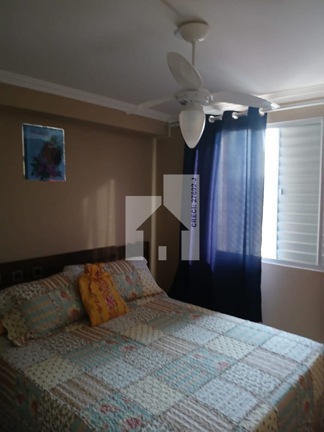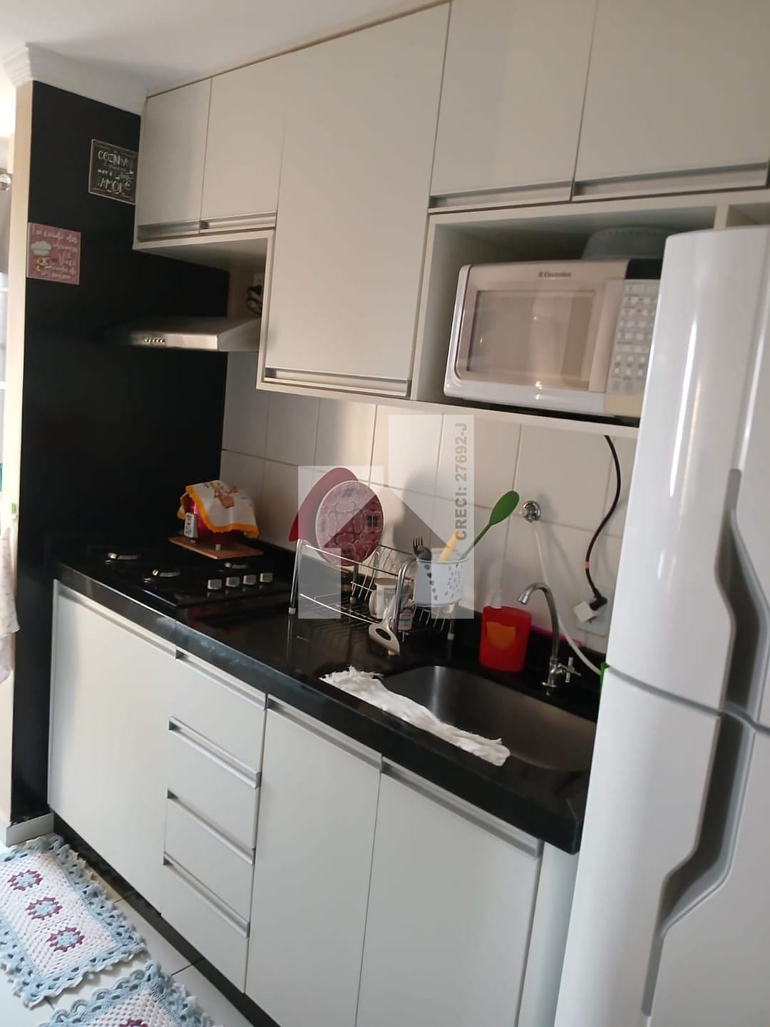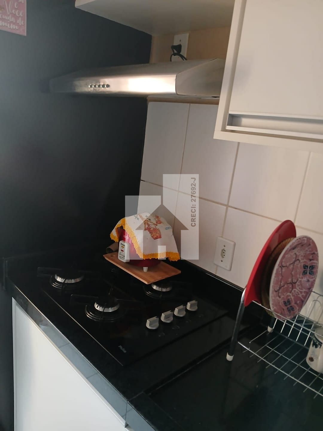 O apartamento possui 2 quartos, porcelanato nos pisos. A cozinha conta um balcão dividindo o ambiente, com armários planejados com coktoop, e depurador facilitando a organização do dia a dia. O banheiro também possui armário e box, otimizando o espaço. Ventilador de teto no quarto e na sala.