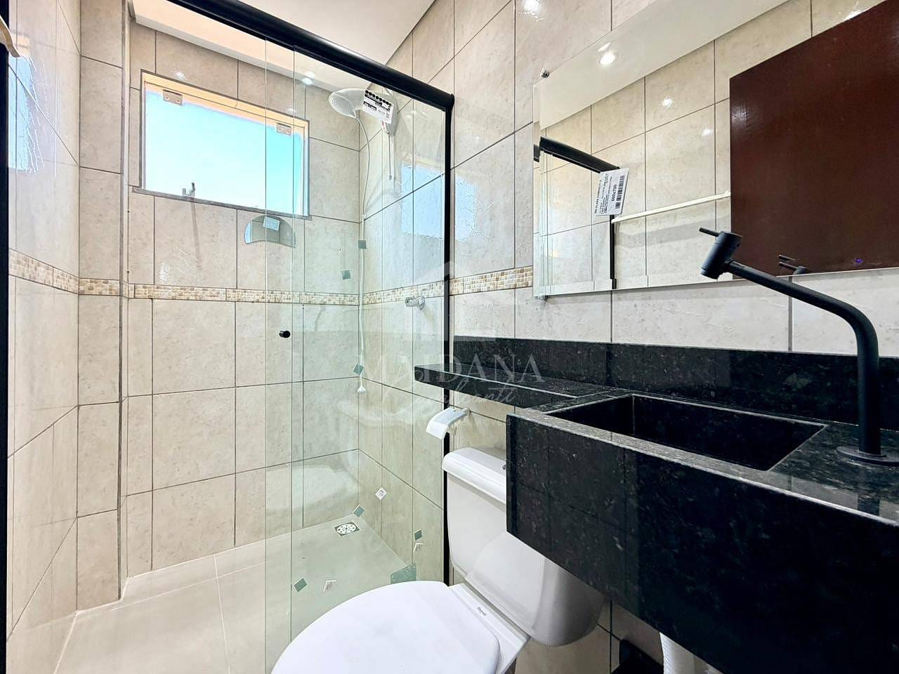 Banheiro social completo com granito, box, espelho e chuveiro