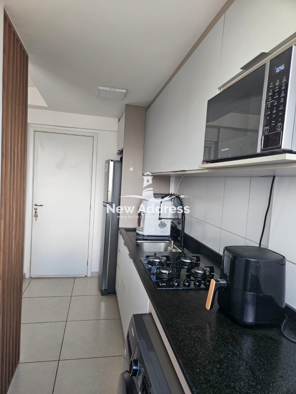 O imóvel possui móveis planejados na cozinha, área de serviço e banheiro, trazendo organização e melhor aproveitamento dos espaços.