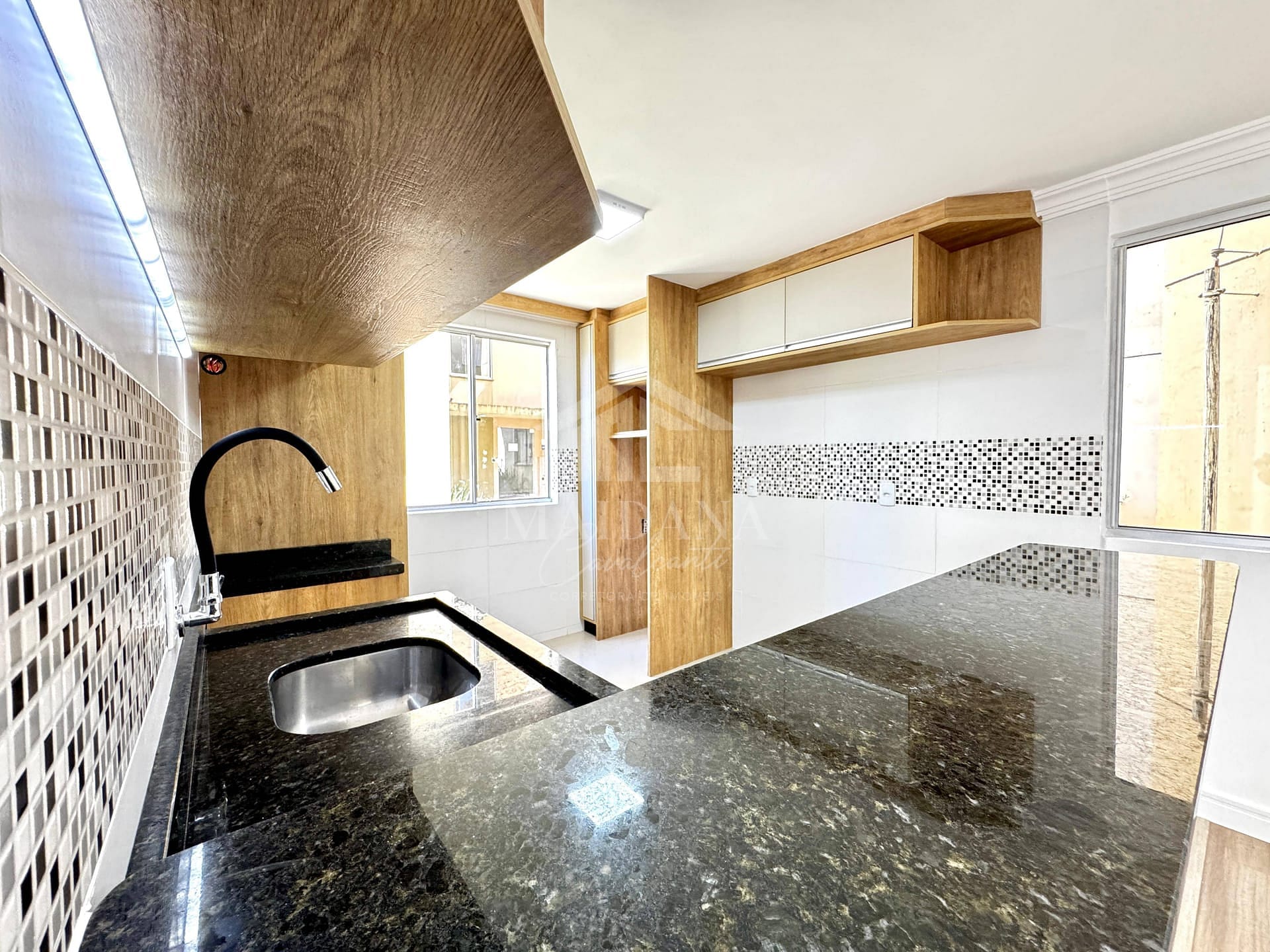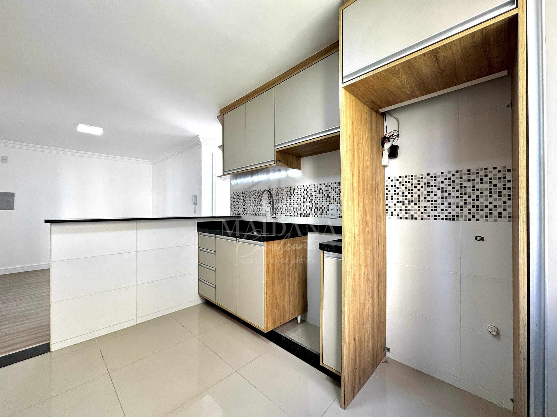 - Cozinha planejada com passa-prato em granito