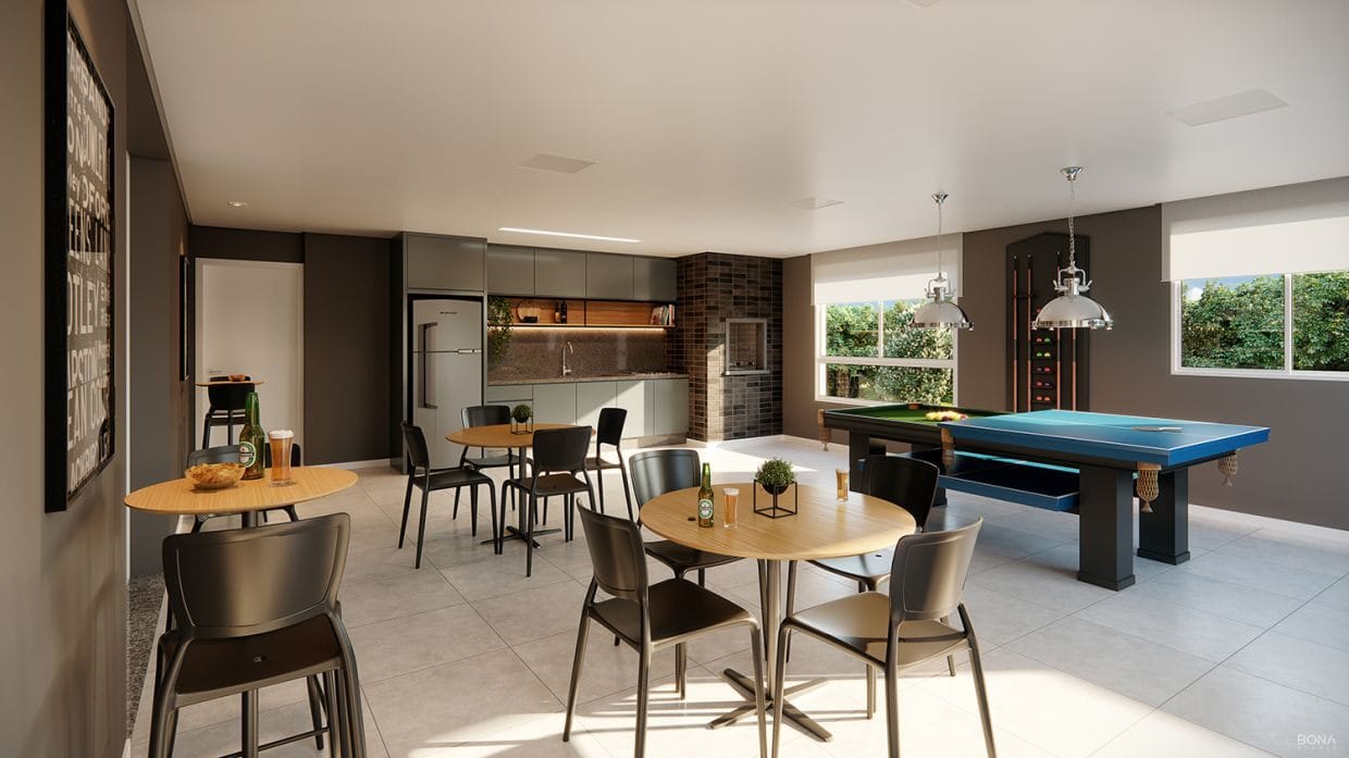* 01 Salão de festas com mesa de sinuca e churrasqueira a carvão;