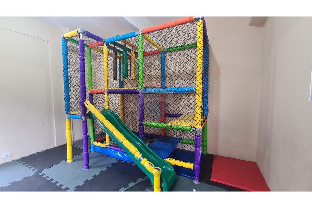 O condomínio é completo: brinquedoteca com brinquedão e piscina de bolinhas, salão de jogos, playground, salão de festas, área gourmet com churrasqueira e forno de pizza, quadra poliesportiva, portaria 24h, câmeras de segurança e zeladoria.