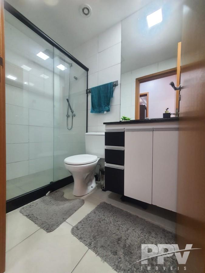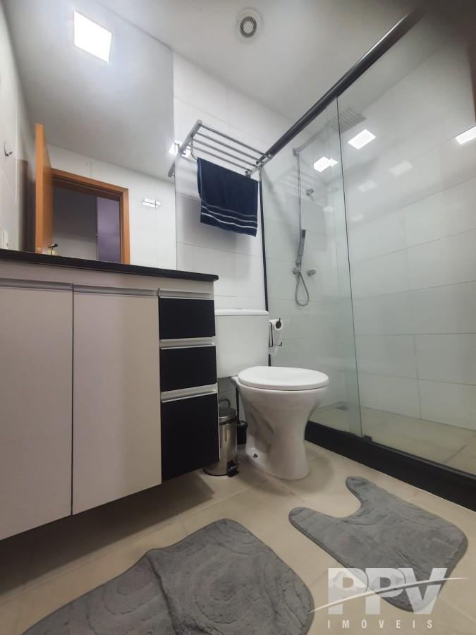 Banheiro social completo com box blindex, móvel planejado e aquecedor a gás;
