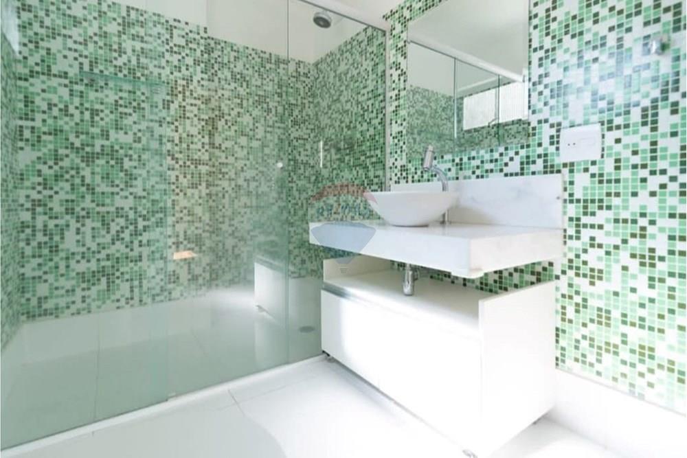 Banheiros Modernos: Reformados com muito bom gosto, possuem box de vidro, gabinetes novos e revestimentos em pastilhas (verdes e azuis) que dão um ar contemporâneo e refrescante.
