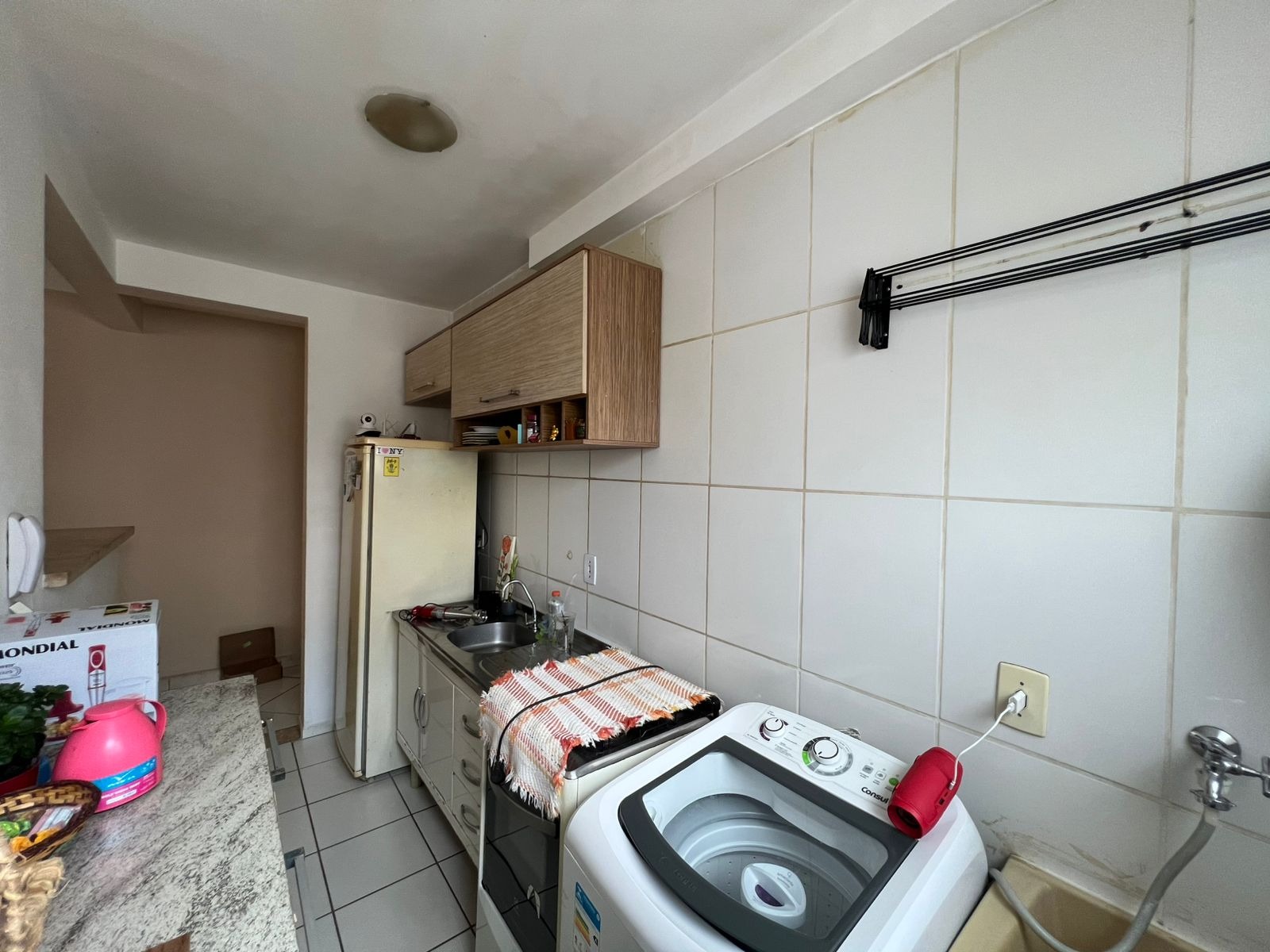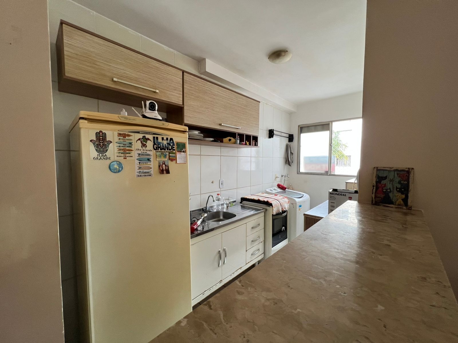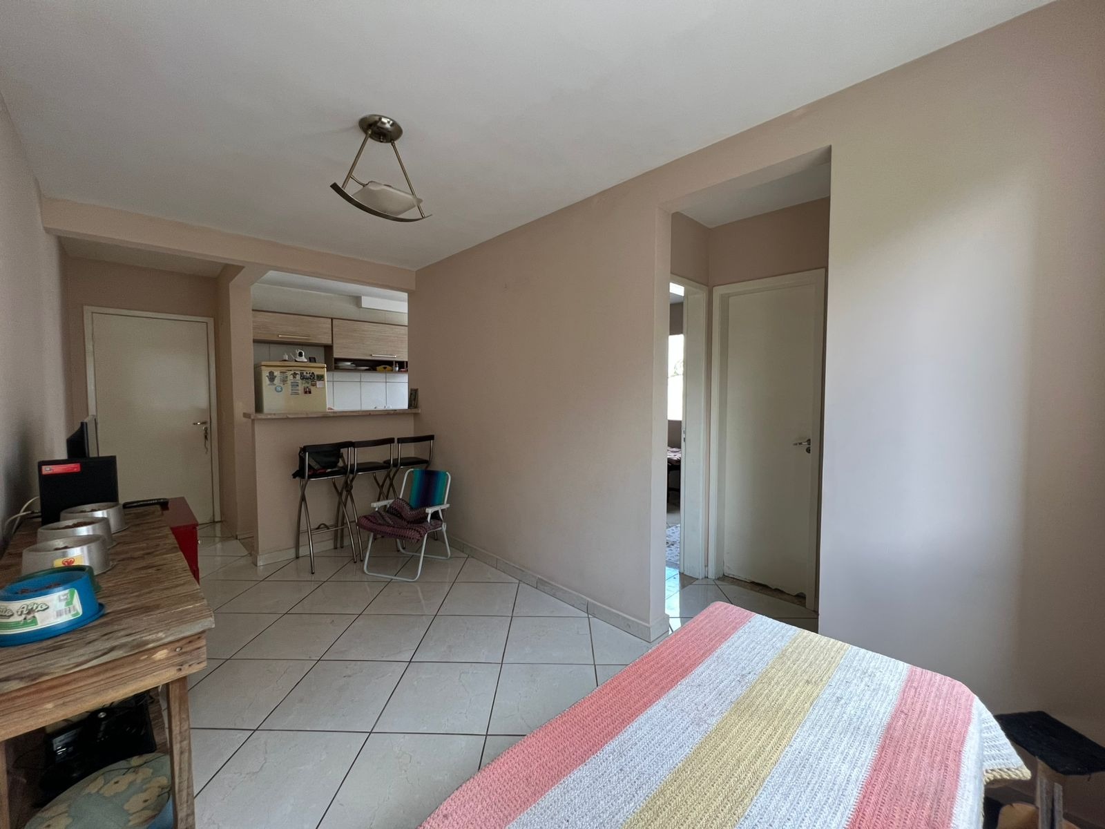 Este imóvel conta com dois quartos bem distribuídos, um banheiro social e uma sala de estar integrada com a sala de jantar, otimizando o espaço e promovendo a convivência. Possui ainda uma área de serviço funcional e uma vaga de estacionamento exclusiva, convenientemente localizada em frente ao bloco. A posição estratégica do bloco, próximo à portaria, garante maior comodidade e facilidade de acesso.