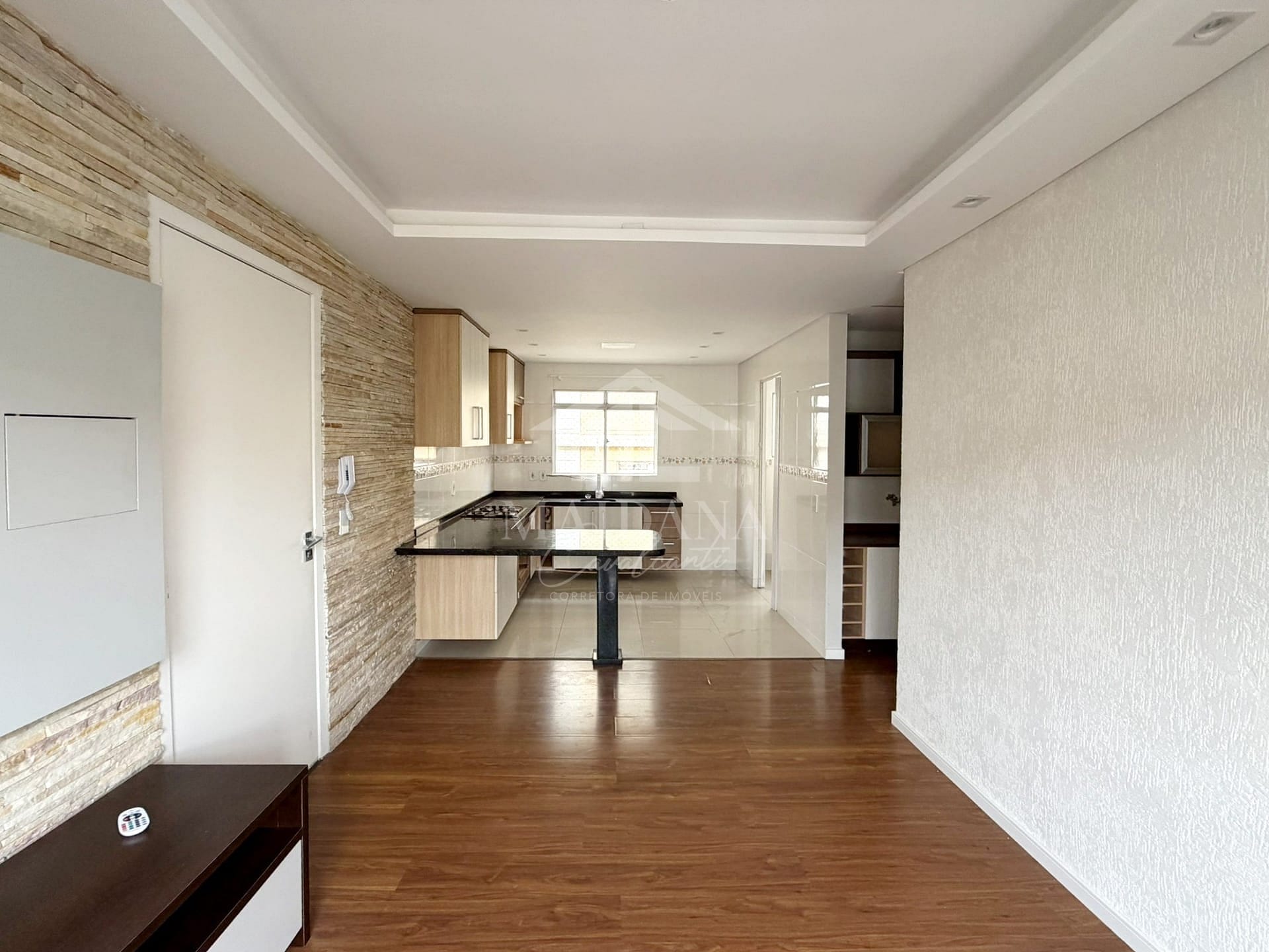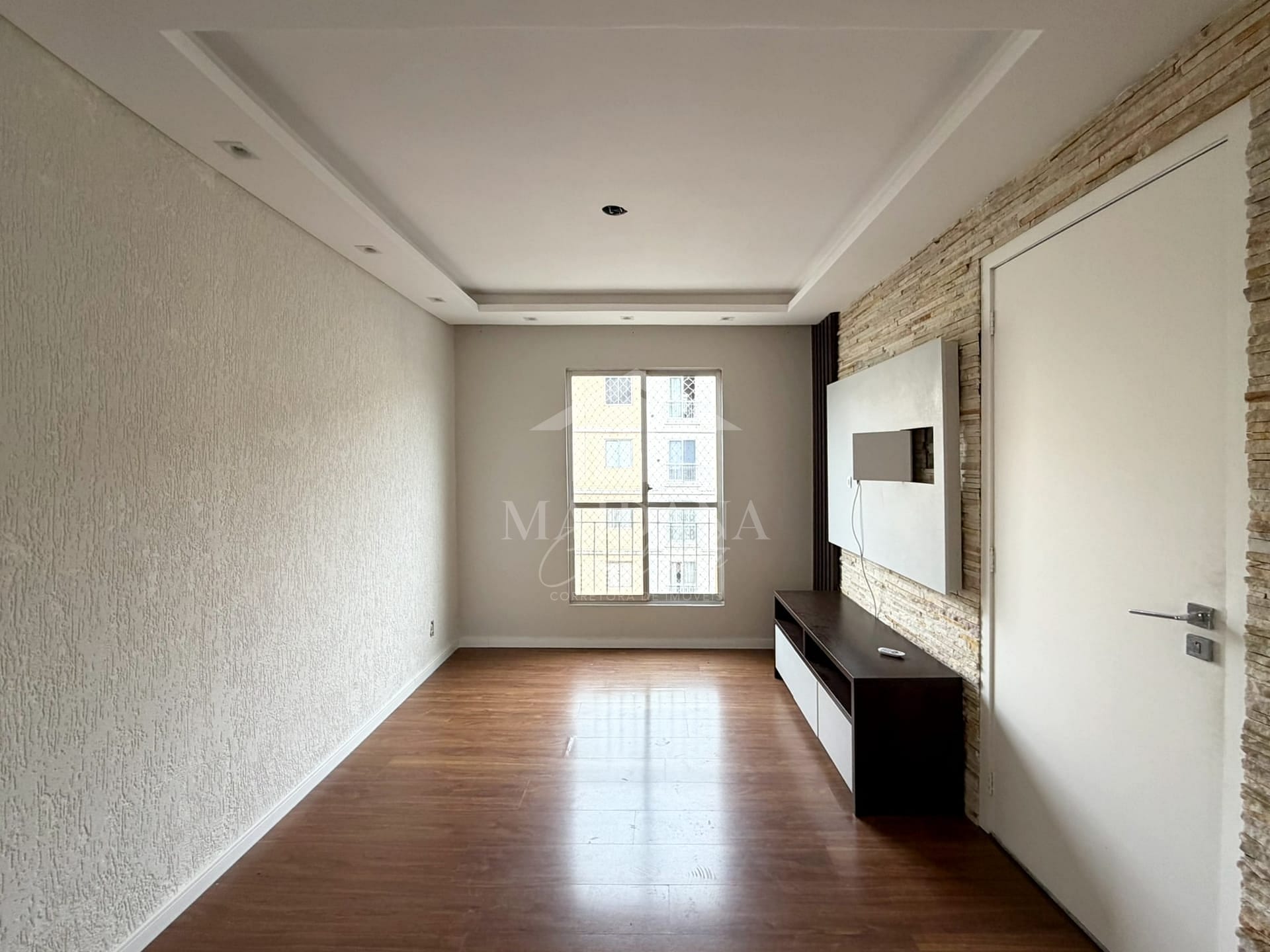 Sala de estar com painel, parede revestida em pedra e rebaixo em gesso;