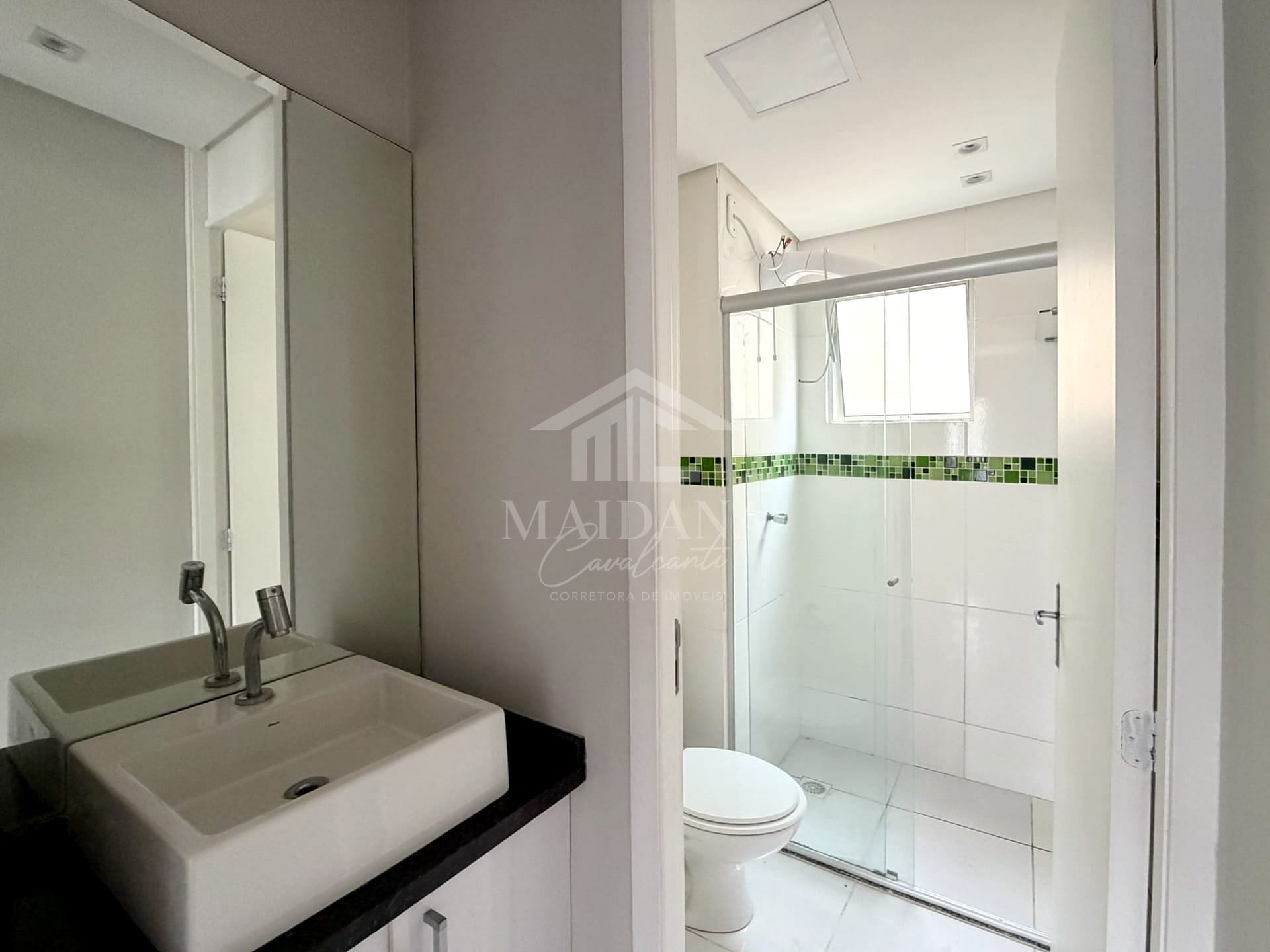 Banheiro social com armário, espelho, cuba e bancada em pedra;