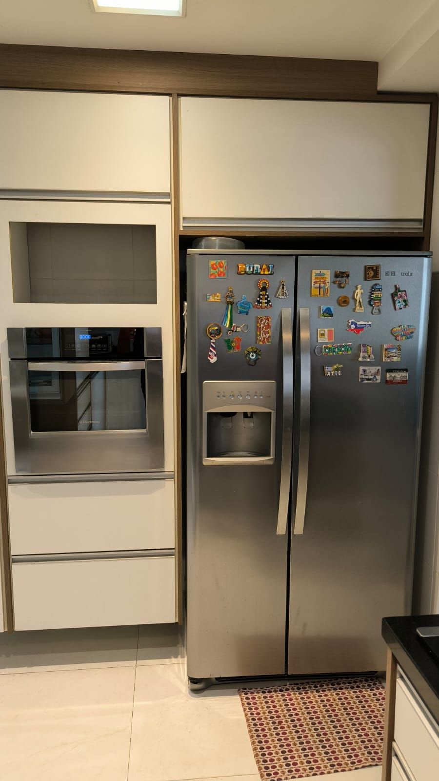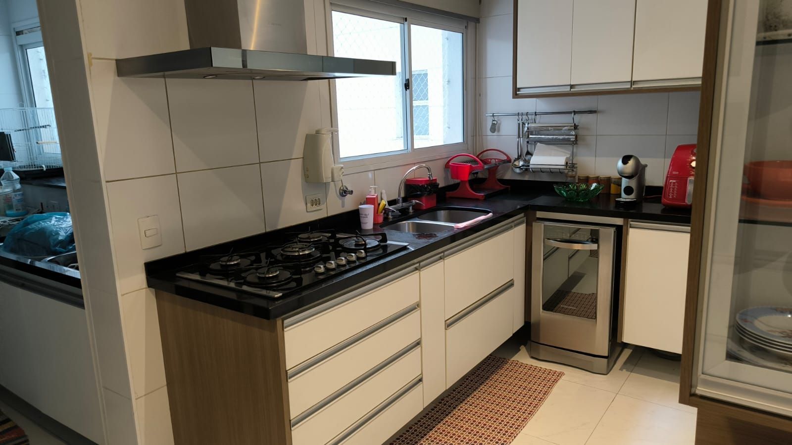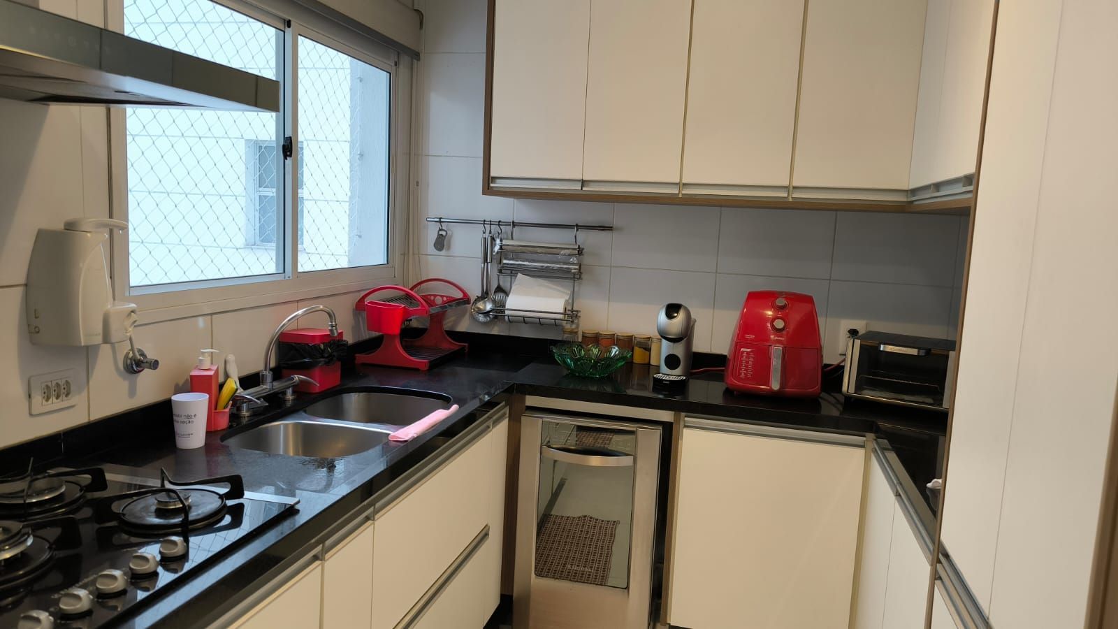 Copa e cozinha com armários sob medida e excelente espaço de armazenamento